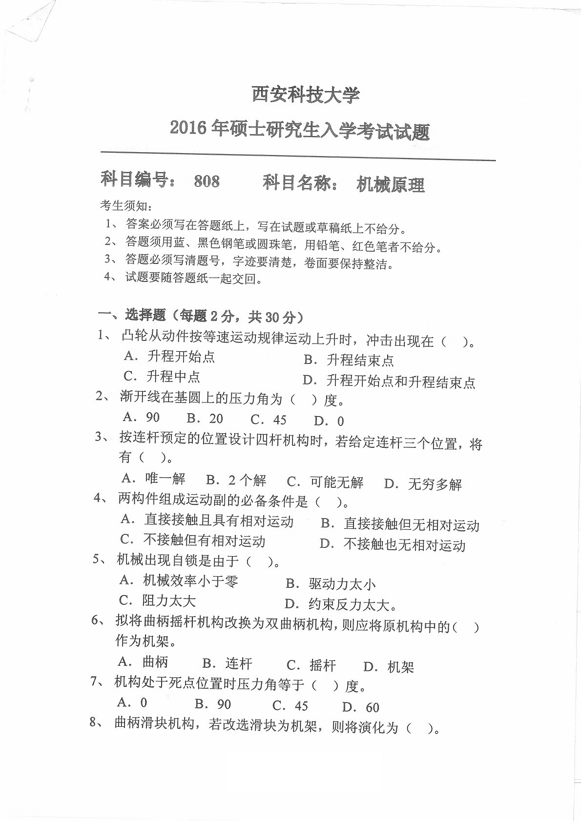 西安科技大学809机械设计基础2016年考研真题