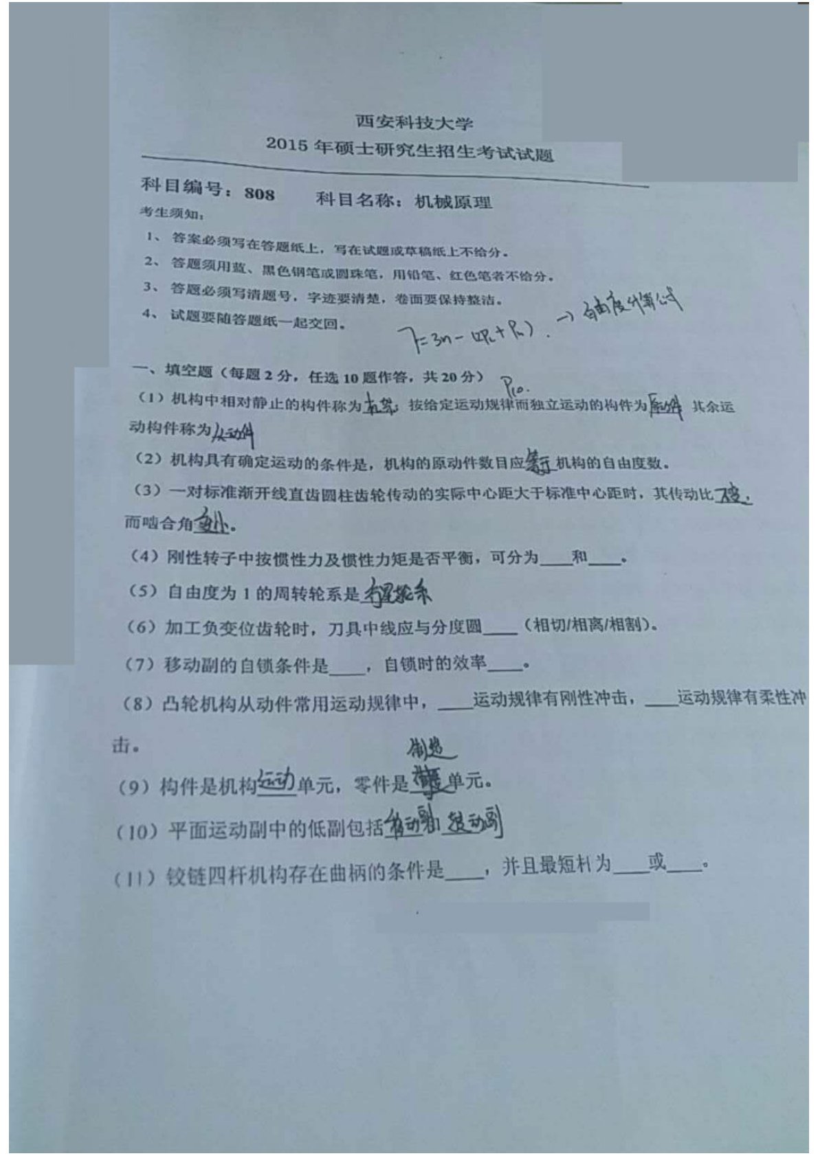 西安科技大学809机械设计基础2015年考研真题
