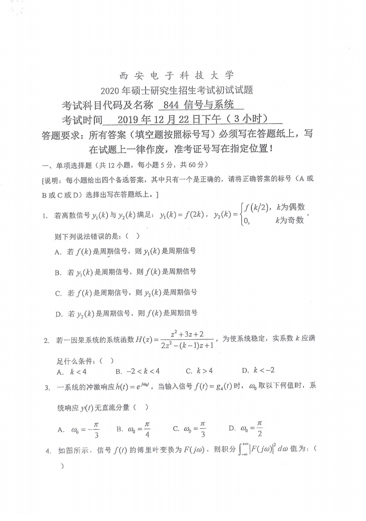 西安电子科技大学844信号与系统2020年真题