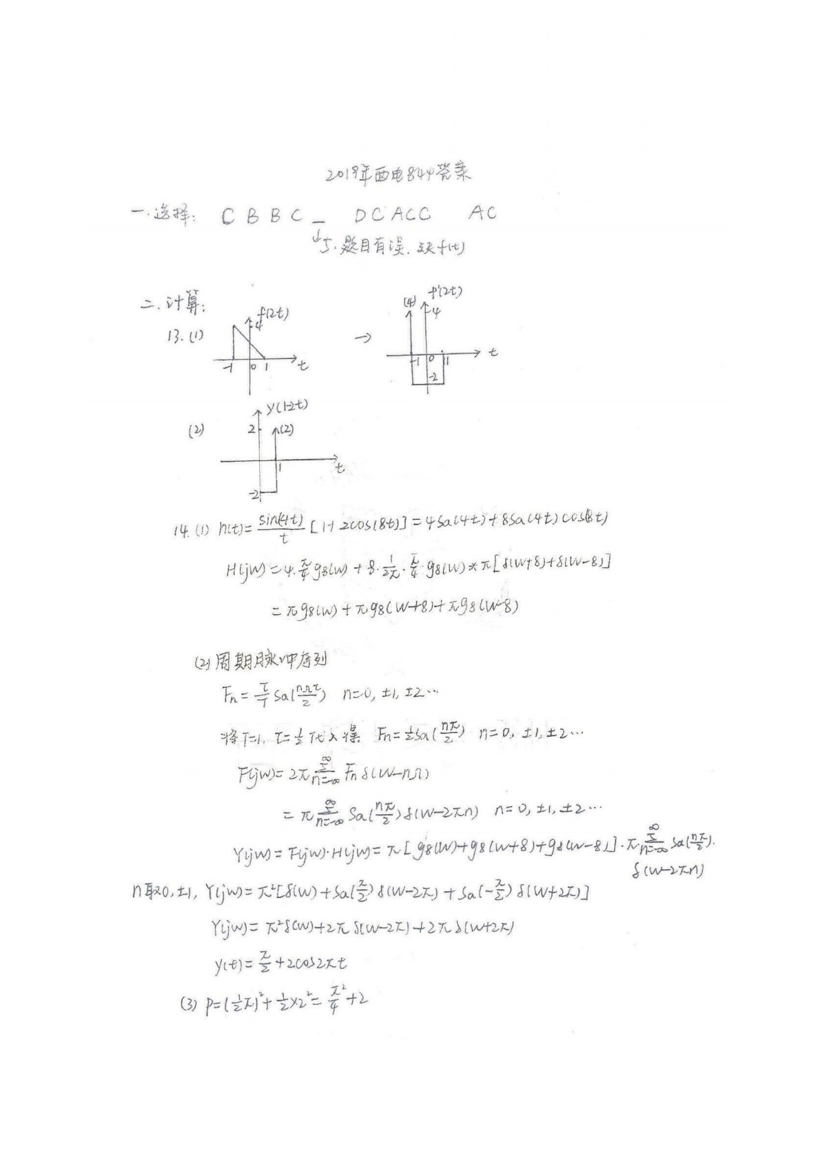 西安电子科技大学844信号与系统2019年真题答案手写版