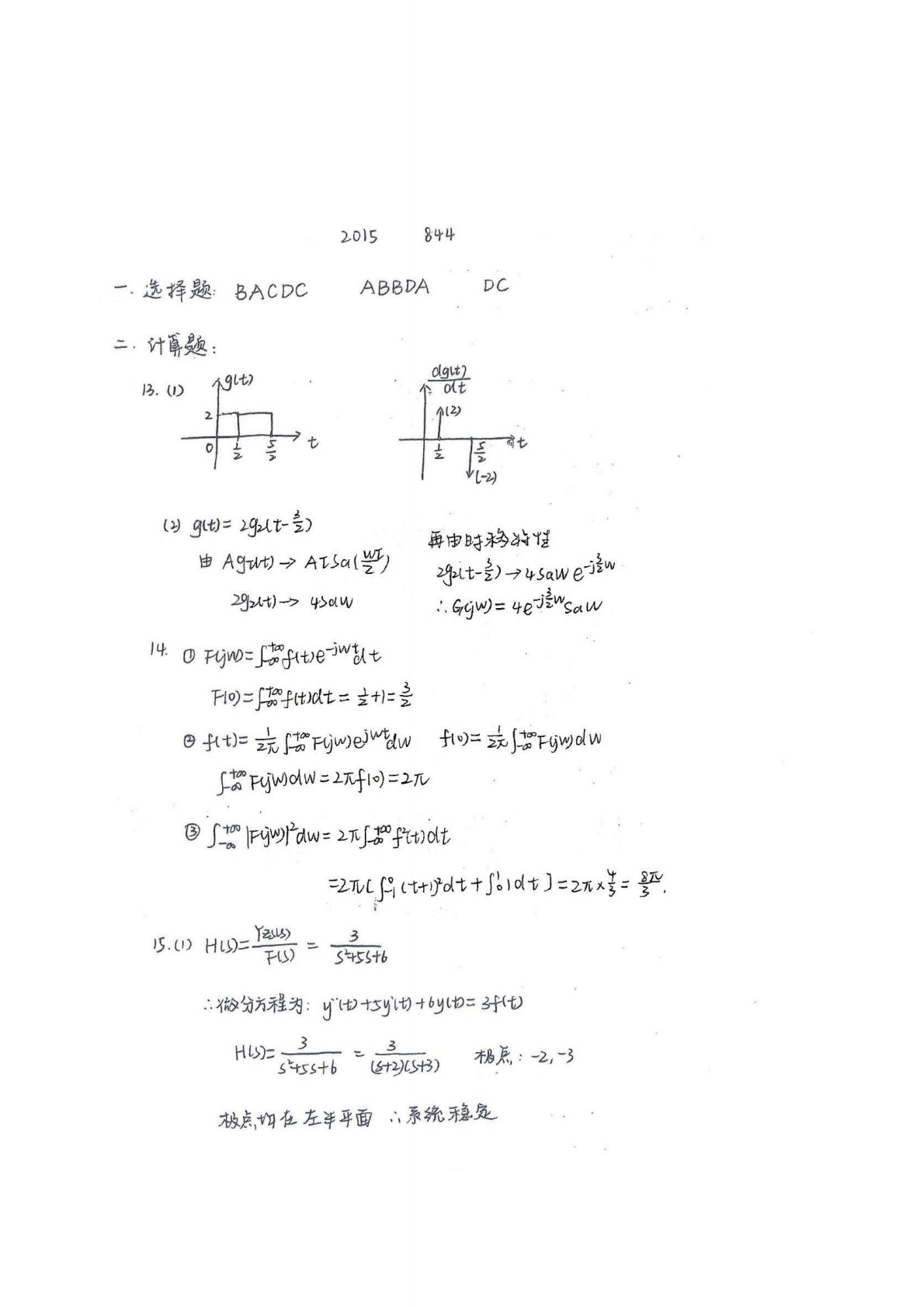 西安电子科技大学844信号与系统2015年真题答案手写版