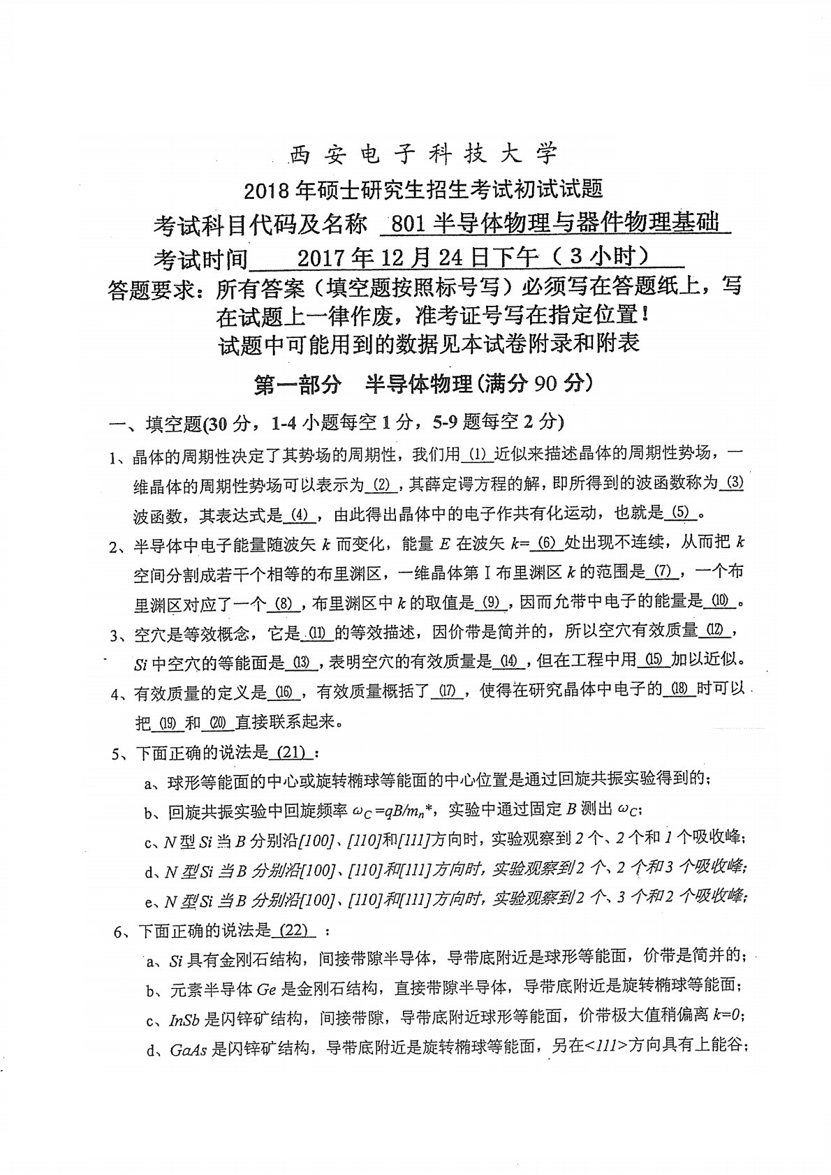 西安电子科技大学801半导体物理2018年真题