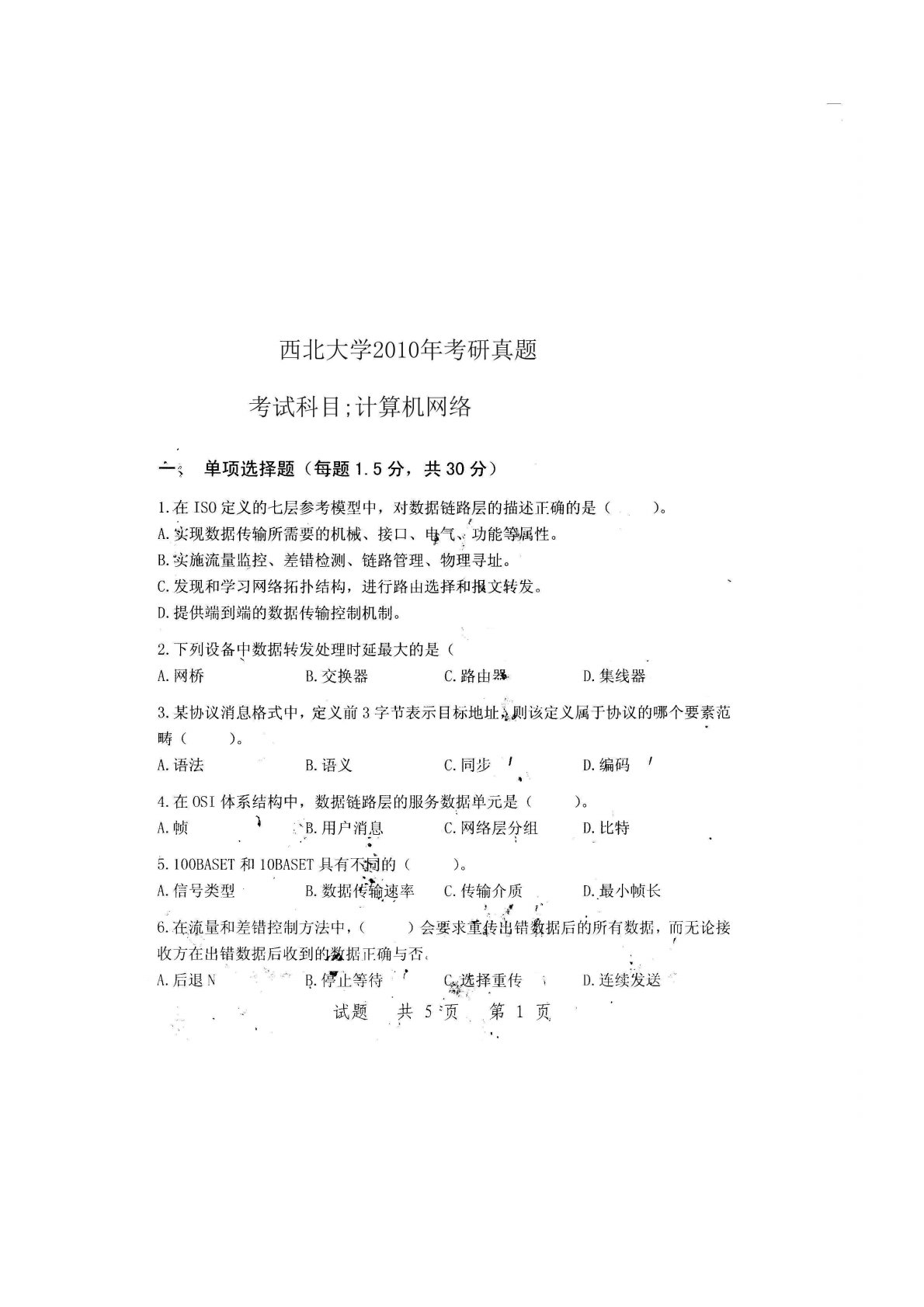 西北大学计算机类专业综合(数据库、计算机组成原理、面向对象程序设计)2010年真题
