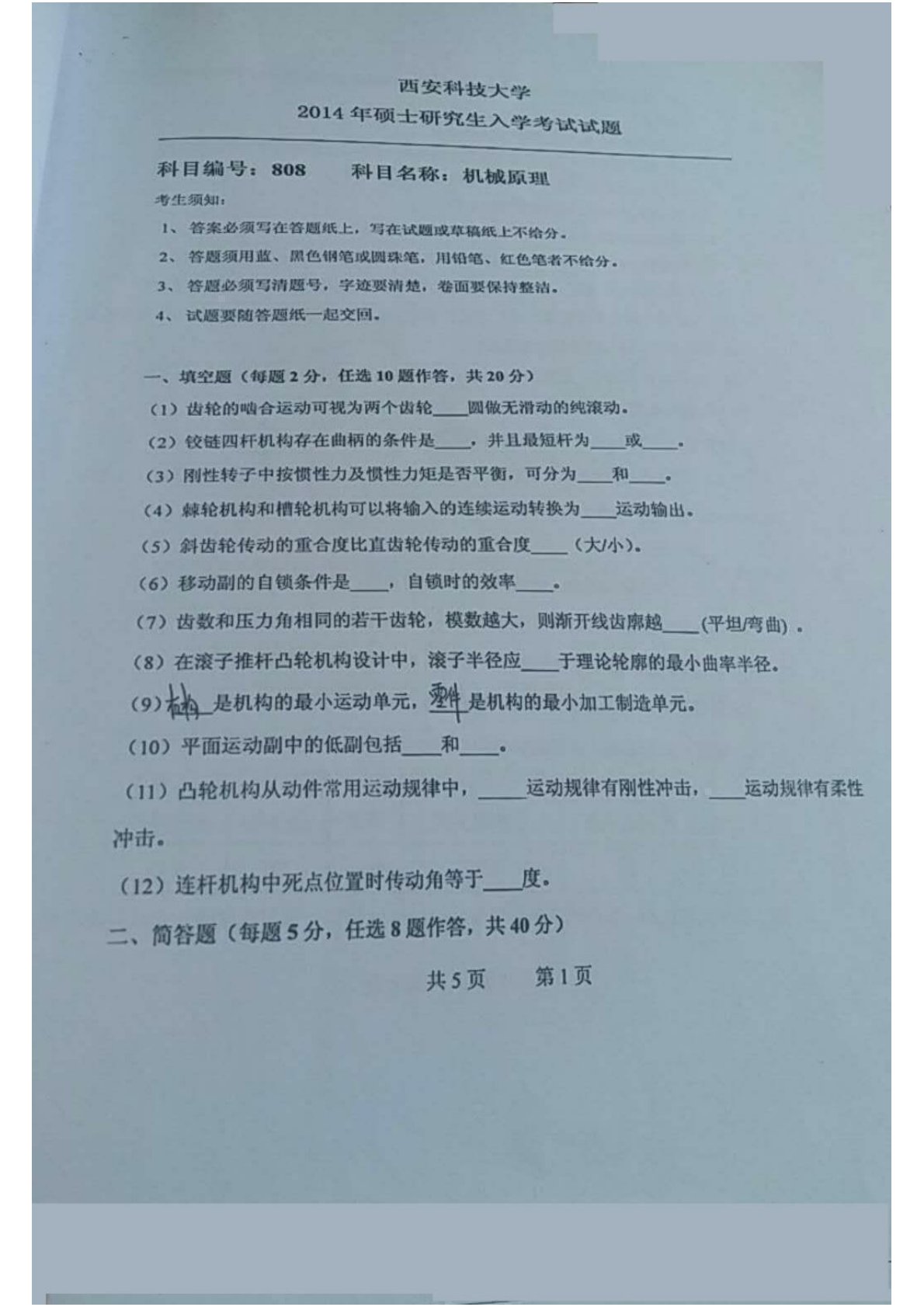 西安科技大学809机械设计基础2014年考研真题