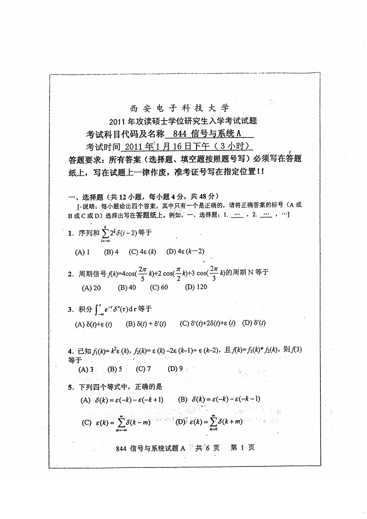 西安电子科技大学844信号与系统2011年真题