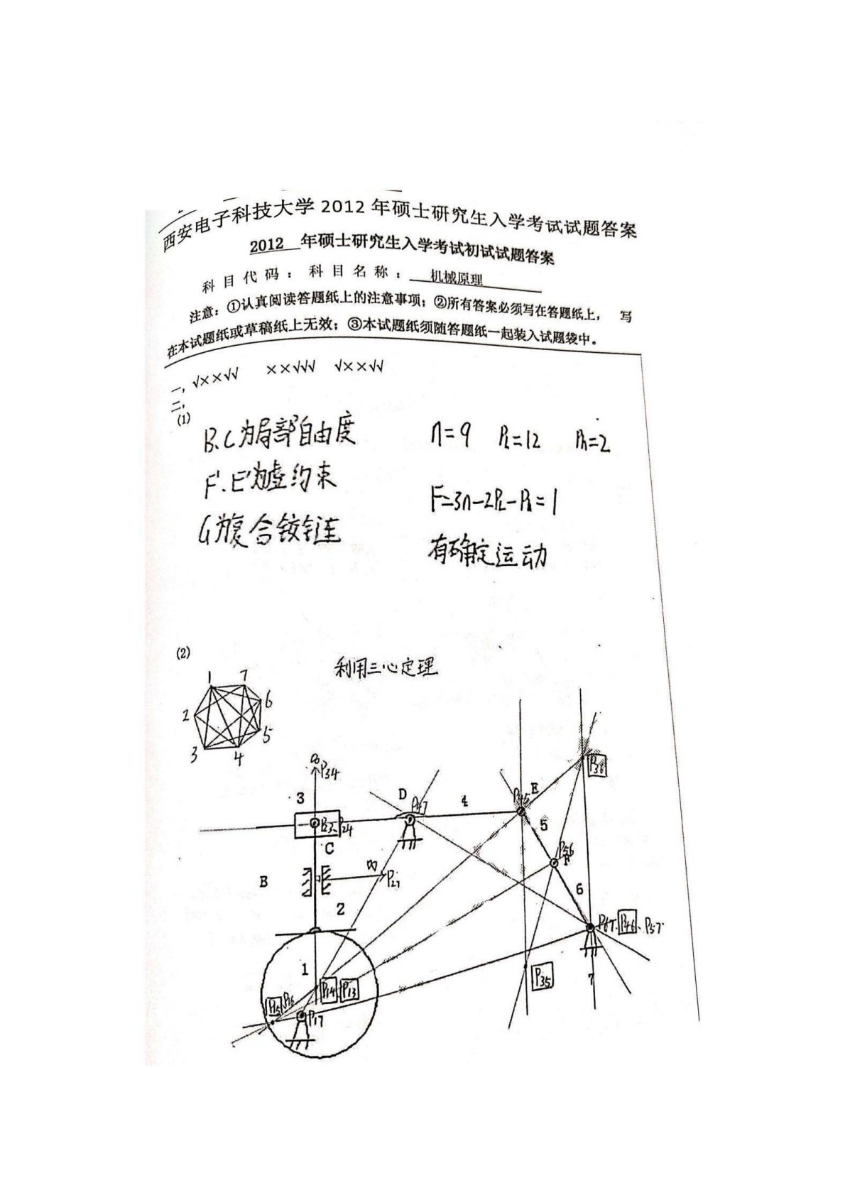 西安电子科技大学841机械原理2012年真题答案手写版
