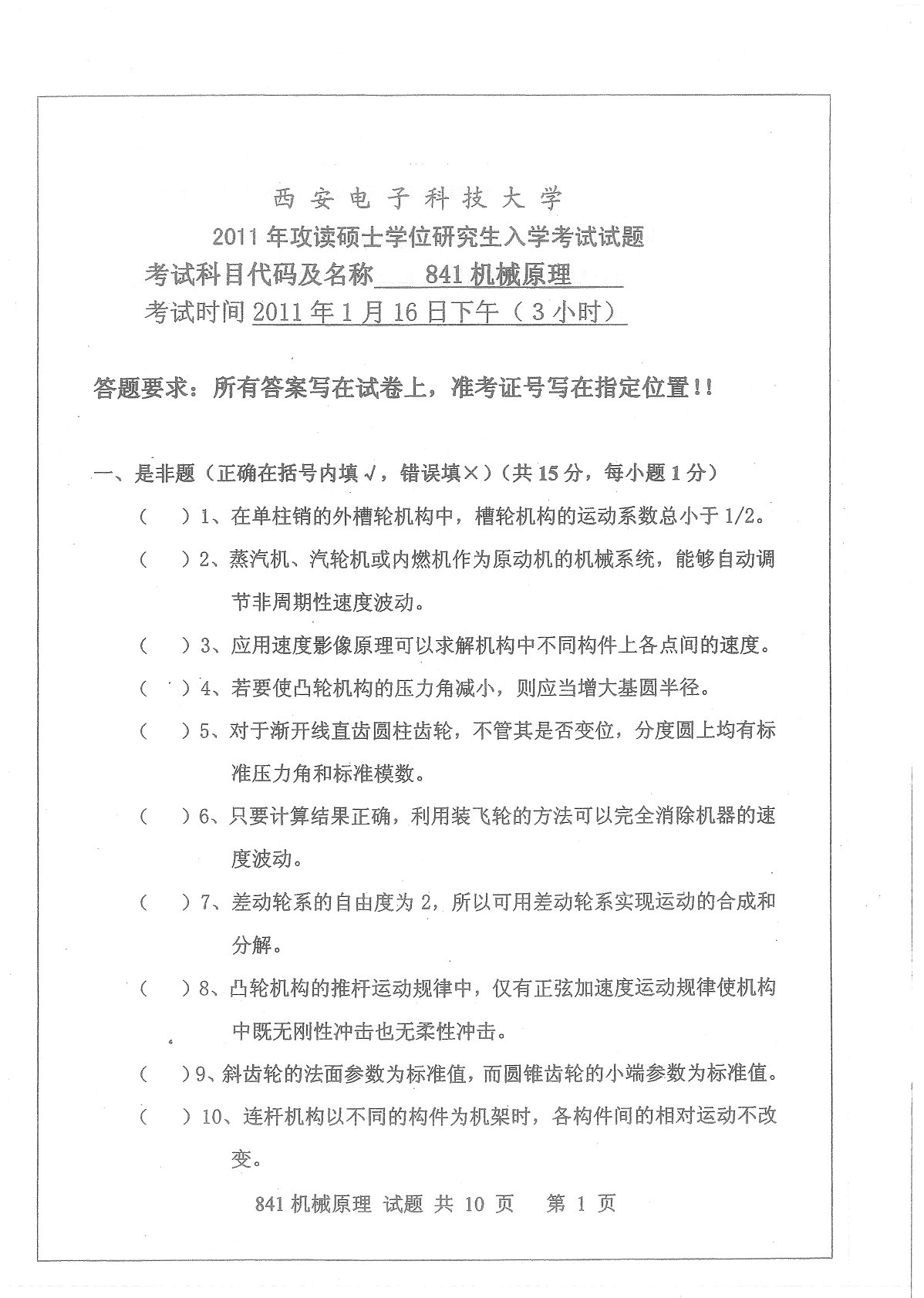 西安电子科技大学841机械原理2011年真题