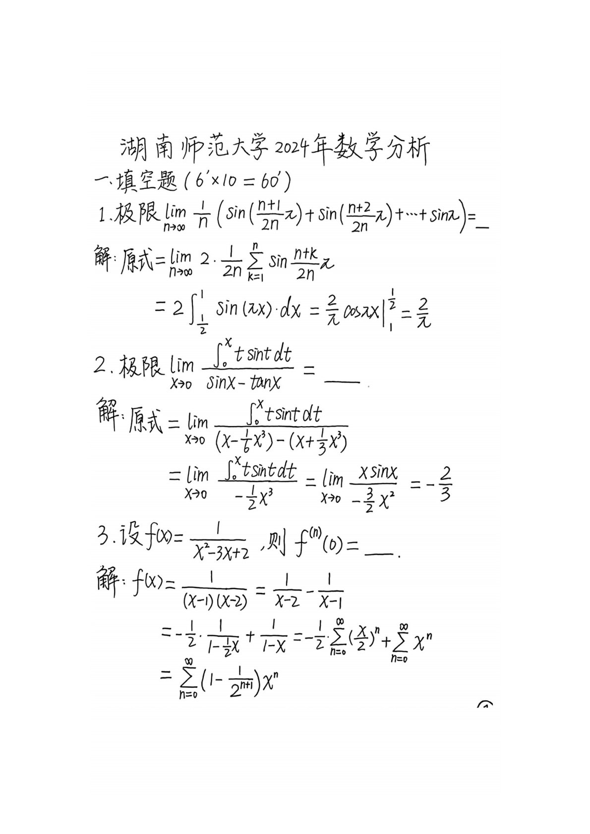 湖南师范大学741数学分析2024年真题答案2
