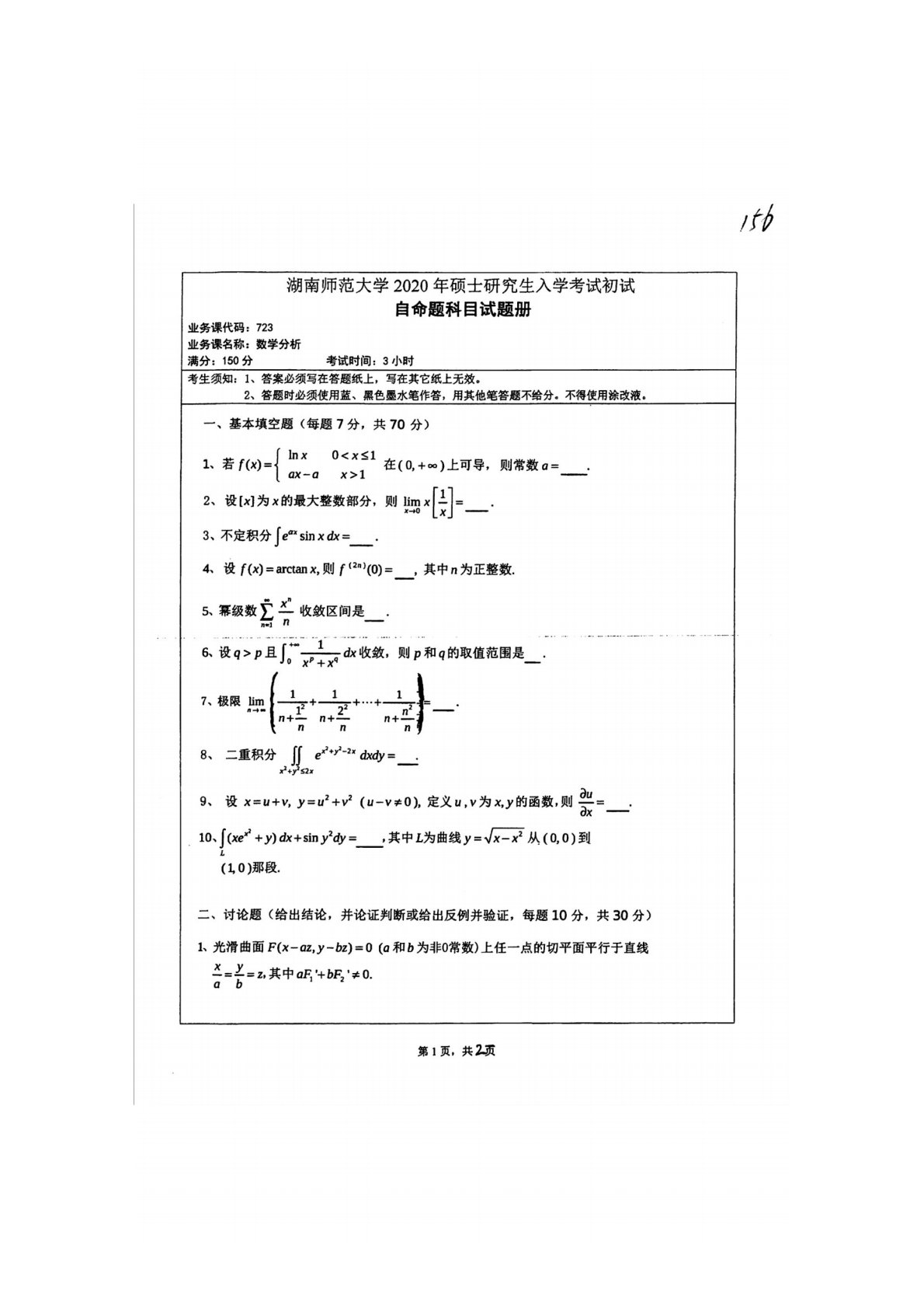 湖南师范大学741数学分析2020年真题