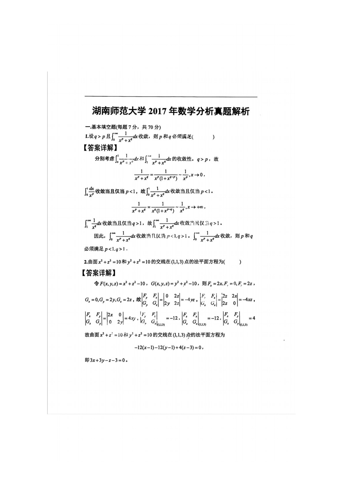 湖南师范大学741数学分析2017年真题答案