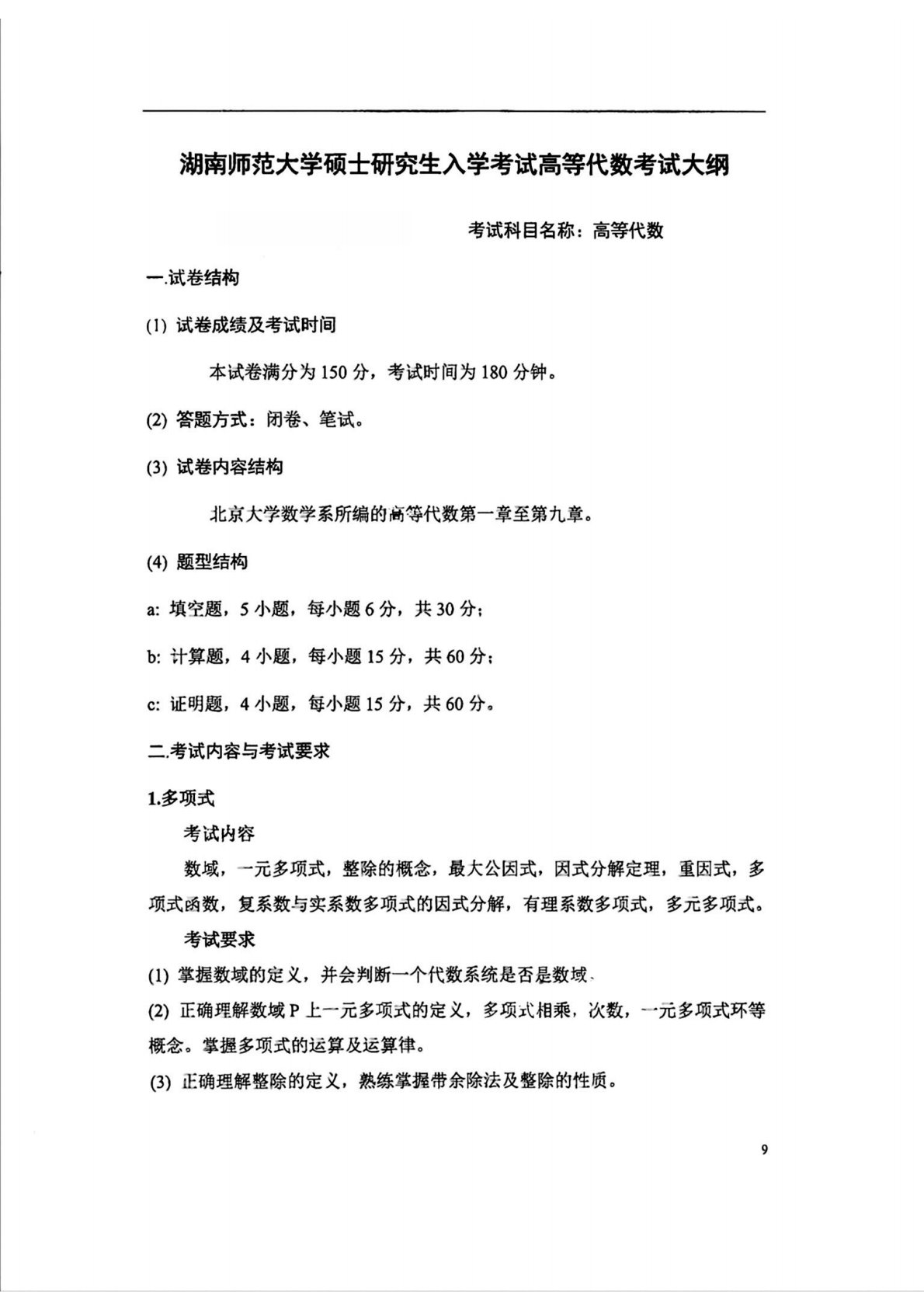 湖南师范大学852高等代数考试大纲