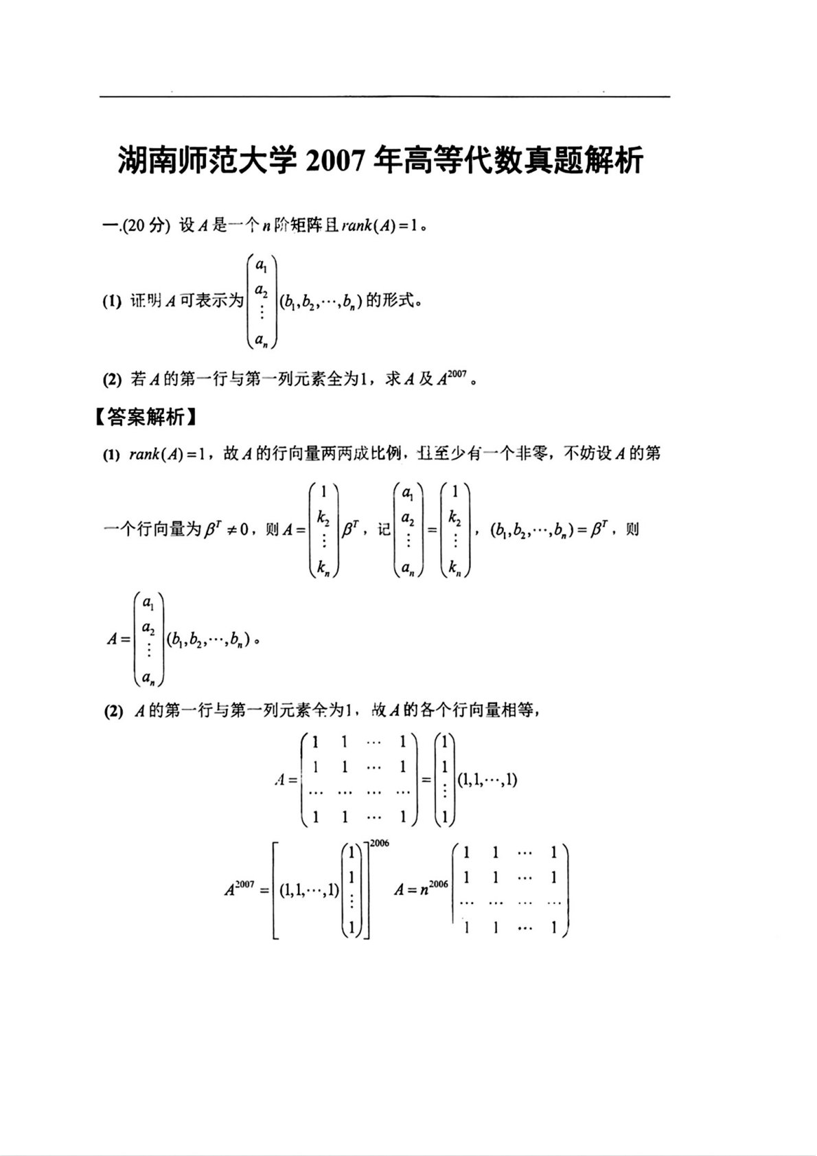 湖南师范大学852高等代数2007年真题答案