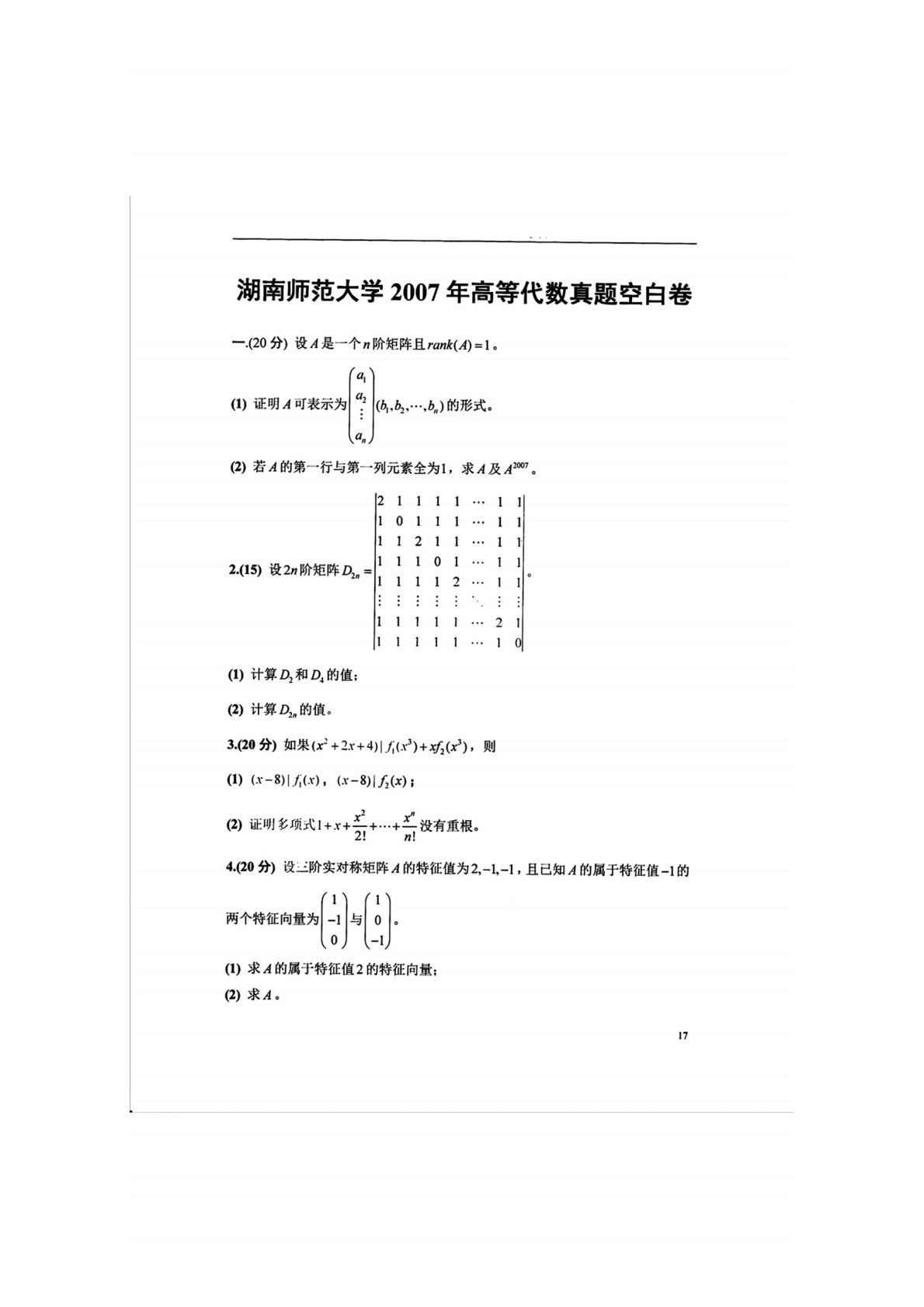 湖南师范大学852高等代数2007年真题