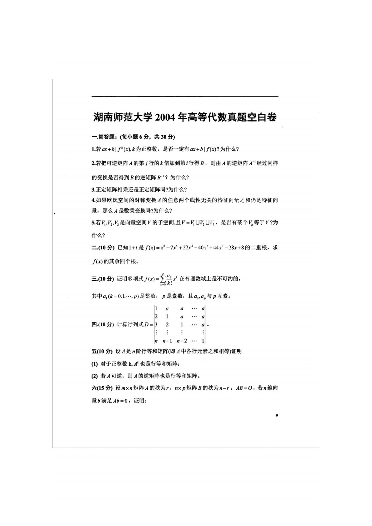 湖南师范大学852高等代数2004年真题