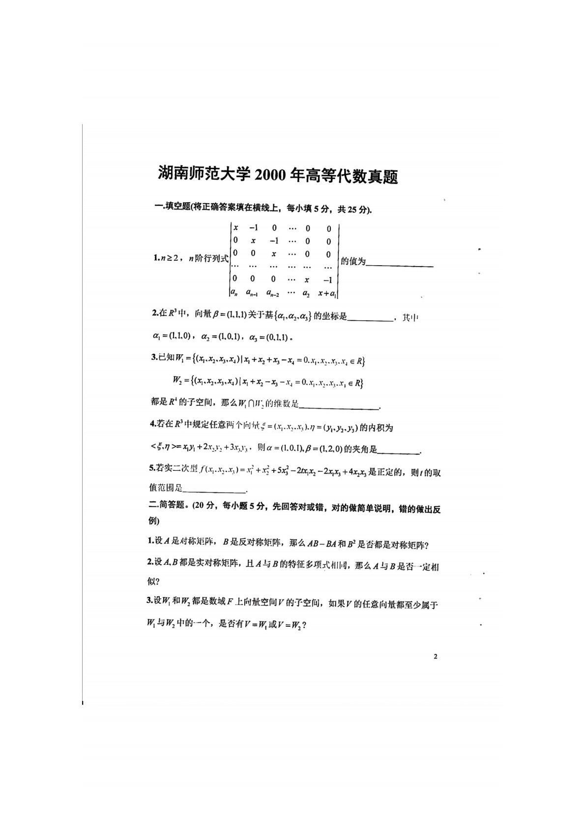 湖南师范大学852高等代数2000年真题