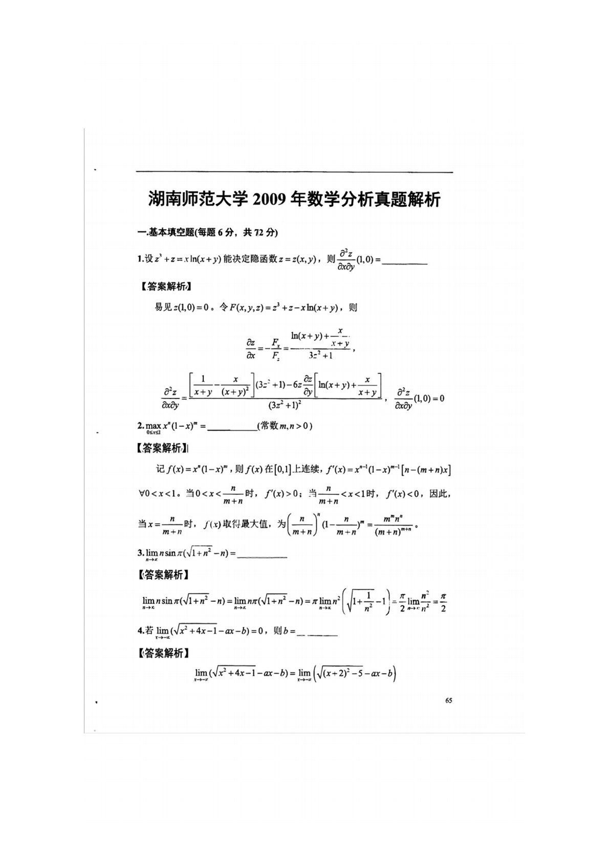 湖南师范大学741数学分析2009年真题答案