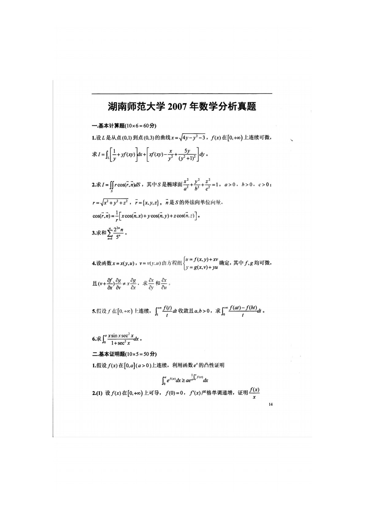 湖南师范大学741数学分析2007年真题