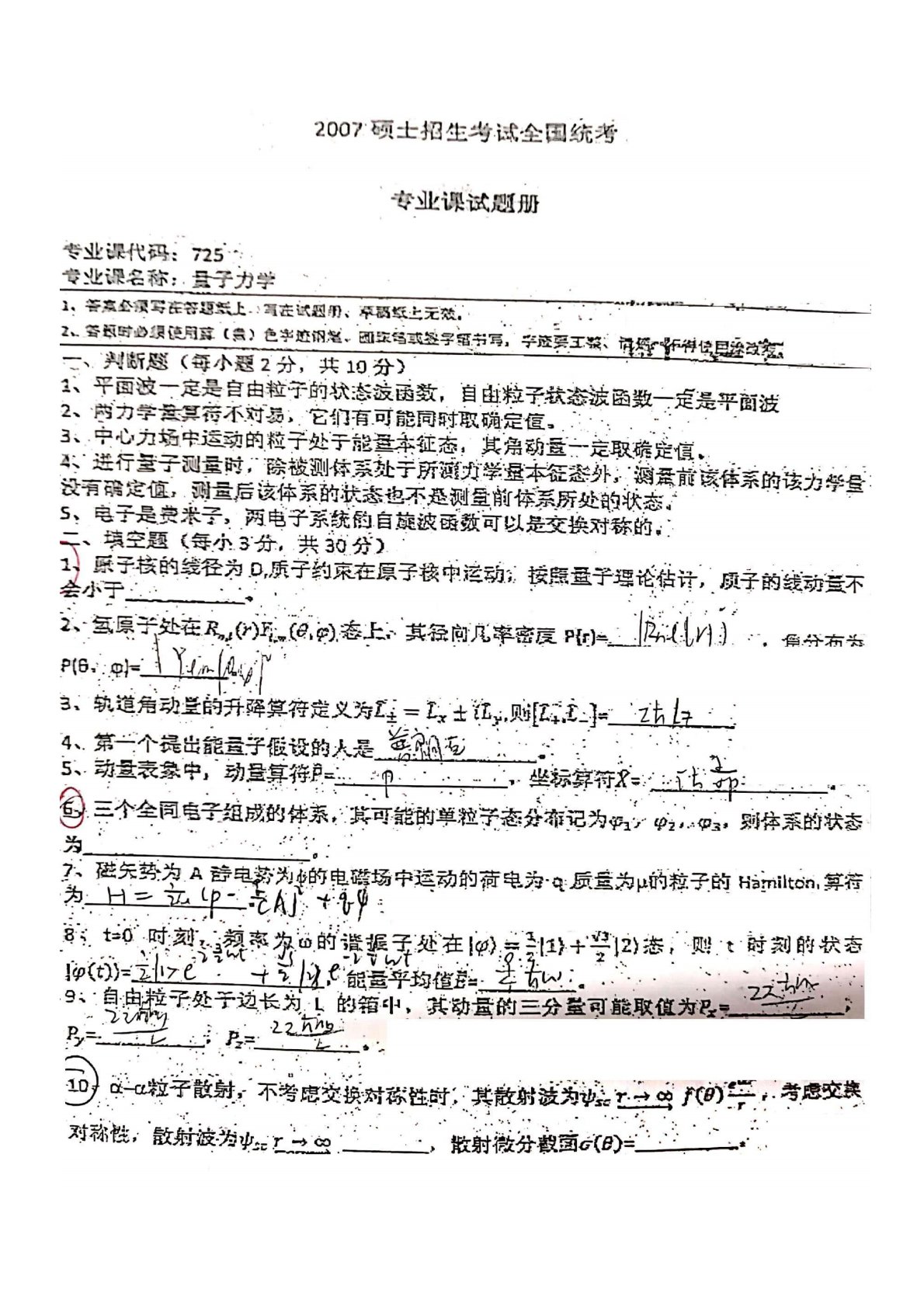 湖南师范大学725量子力学2007年考研真题