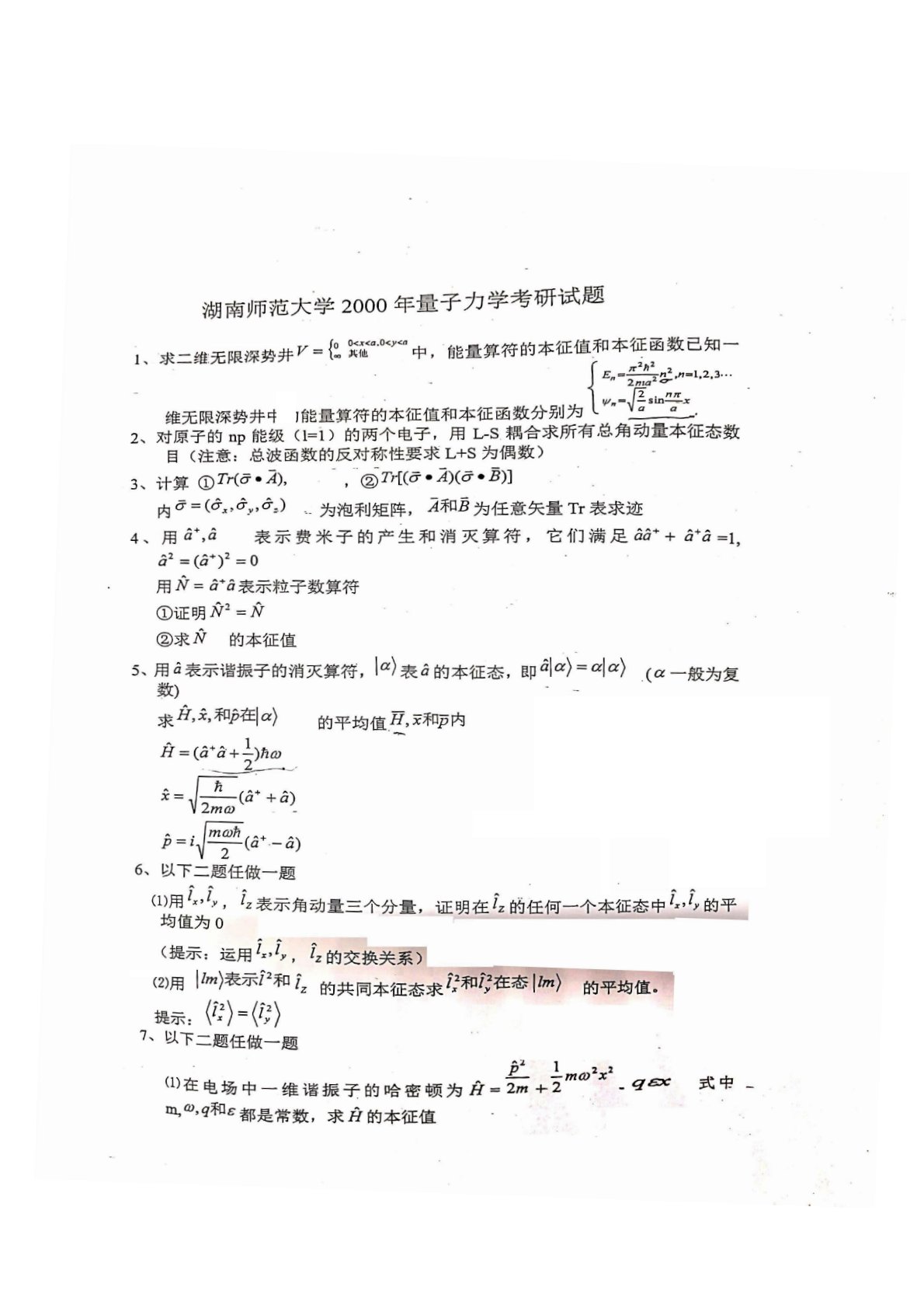 湖南师范大学725量子力学2000年考研真题