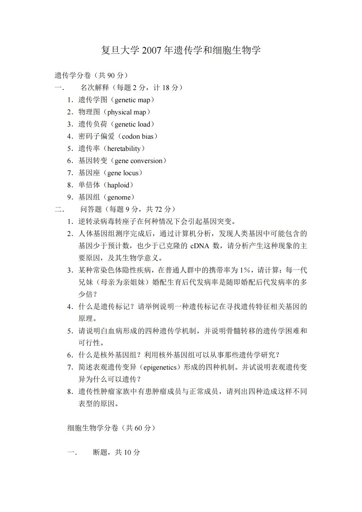 复旦大学873遗传学与细胞生物学2007年真题回忆版1