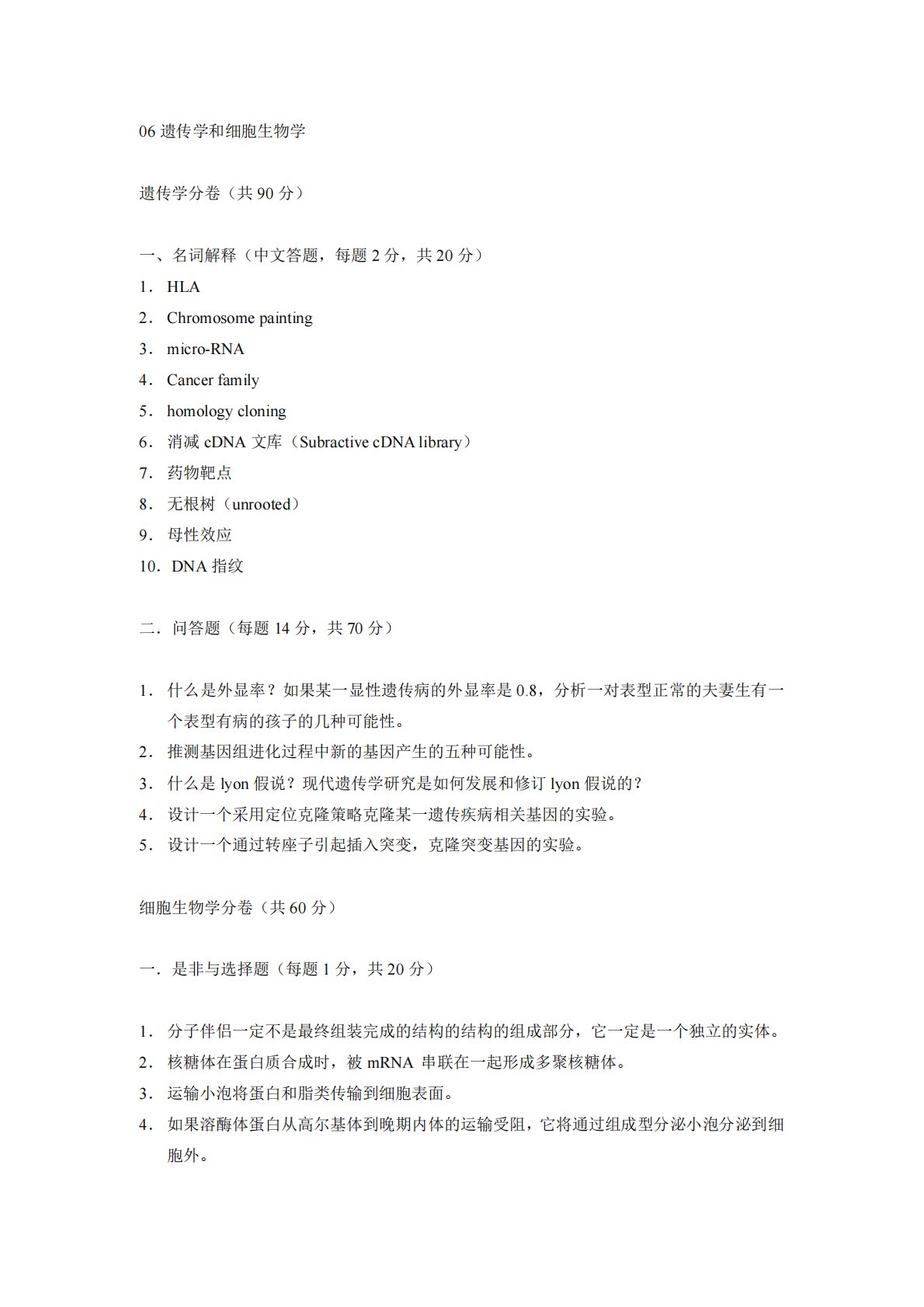 06遗传学和细胞生物学遗传学分卷(共90分)一、名词解释(中文答题,每题2分,共20分)1.HLA2.Chromosomepainting3.micro-RNA4.Cancerfamily5.homologycloning6.消减cDNA文库(SubractivecDNAlibrary)7.药物靶点8.无根树(unrooted)9.母性效应10.DNA指纹二.问答题(每题14分,共70分)1.什么是外显率?如果某一显性遗传病的外显率是0.8,分析一对表型正常的夫妻生有一个表型有病的孩子的几种可能性。2.推测基因组进化过程中新的基因产生的五种可能性。3.什么是lyon假说?现代遗传学研究是如何发...
