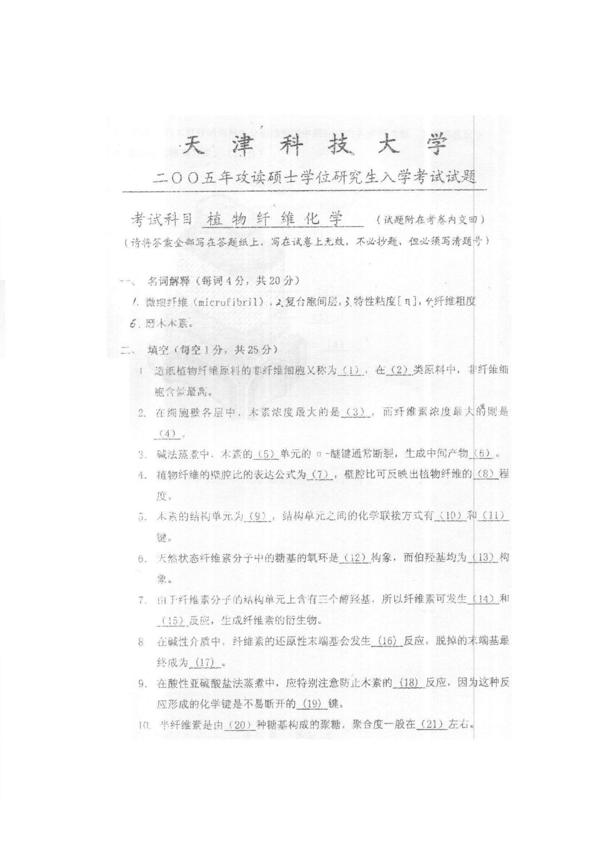 天津科技大学806植物纤维化学2005年真题