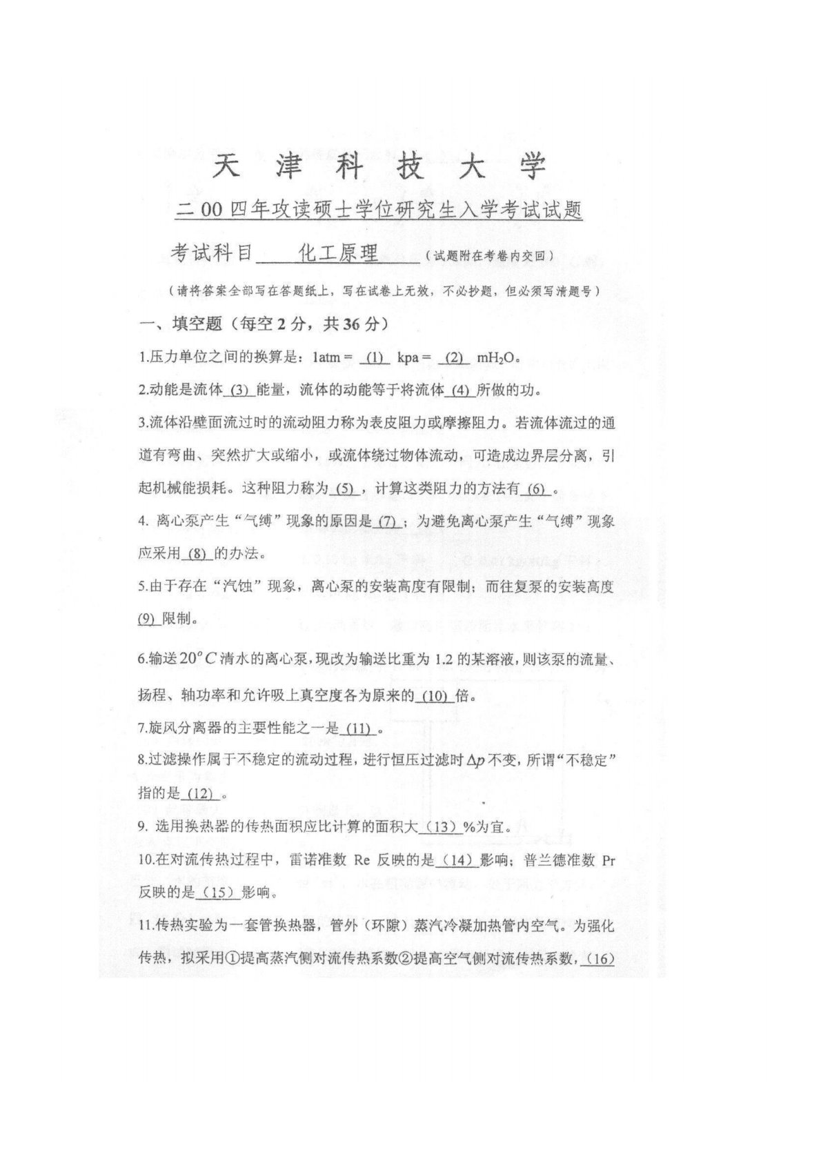 天津科技大学803化工原理2004年真题