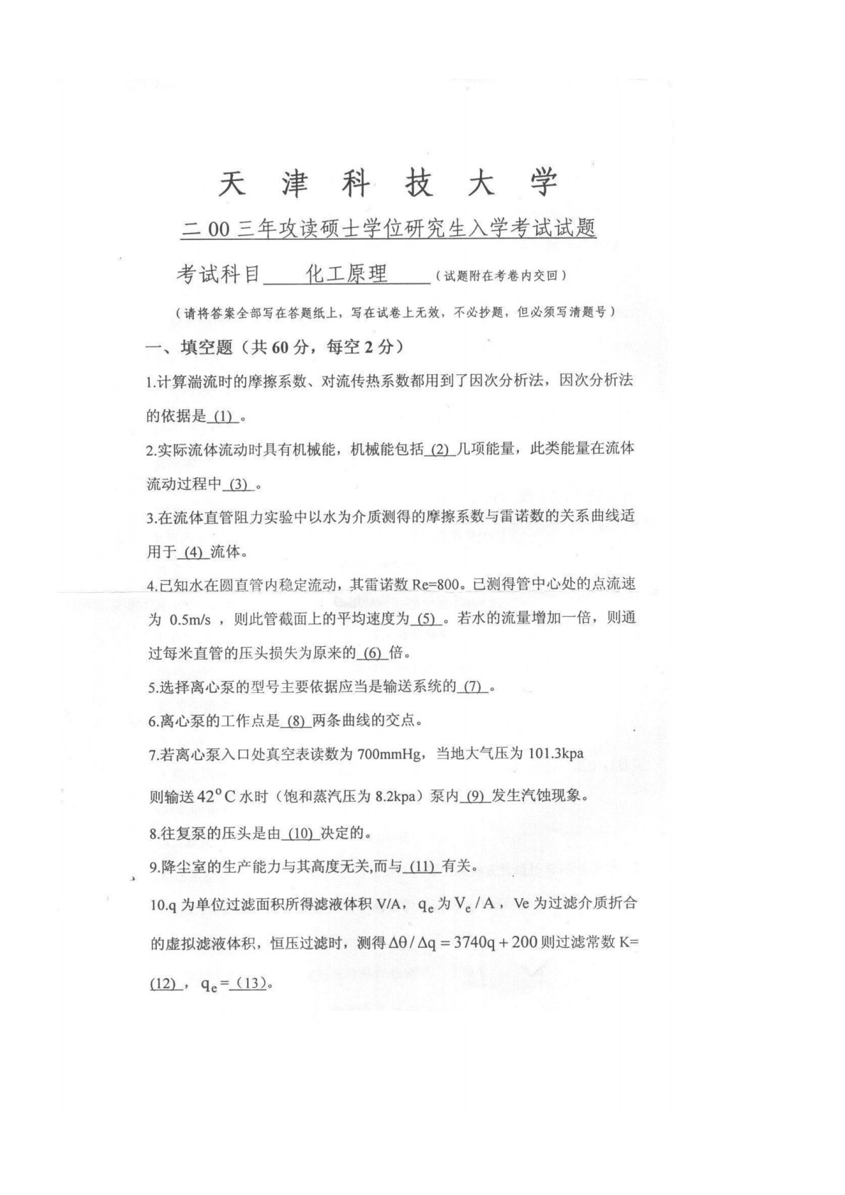 天津科技大学803化工原理2003年真题