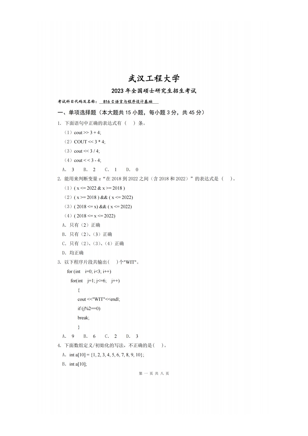武汉工程大学816C语言与程序设计2023年真题