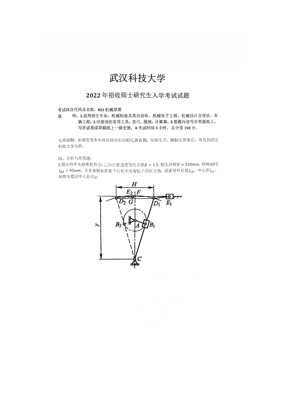 武汉科技大学811机械原理2022年真题