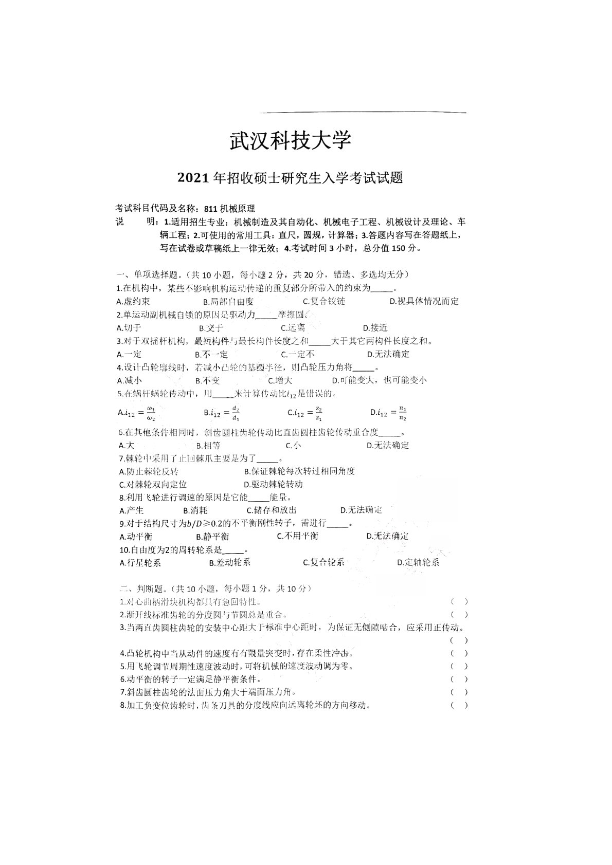 武汉科技大学811机械原理2021年真题