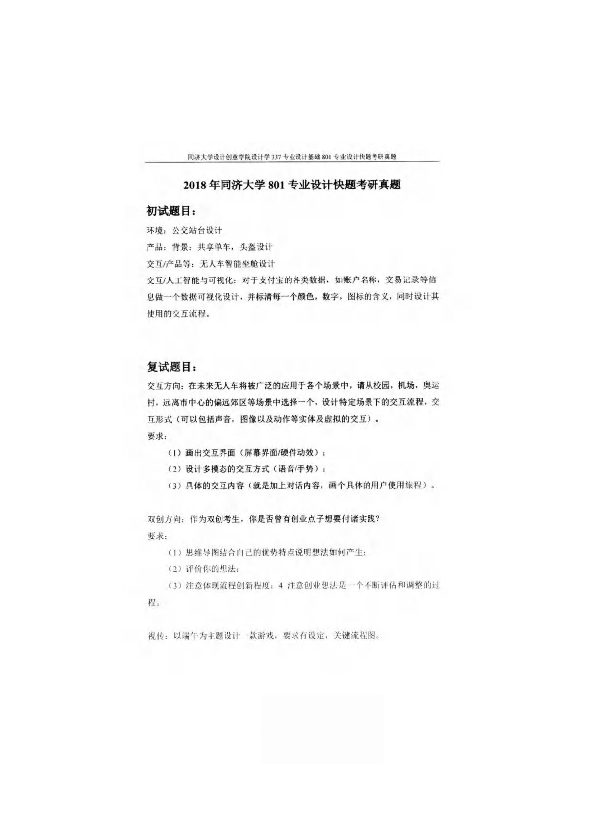 同济大学901专业设计快题2018年真题