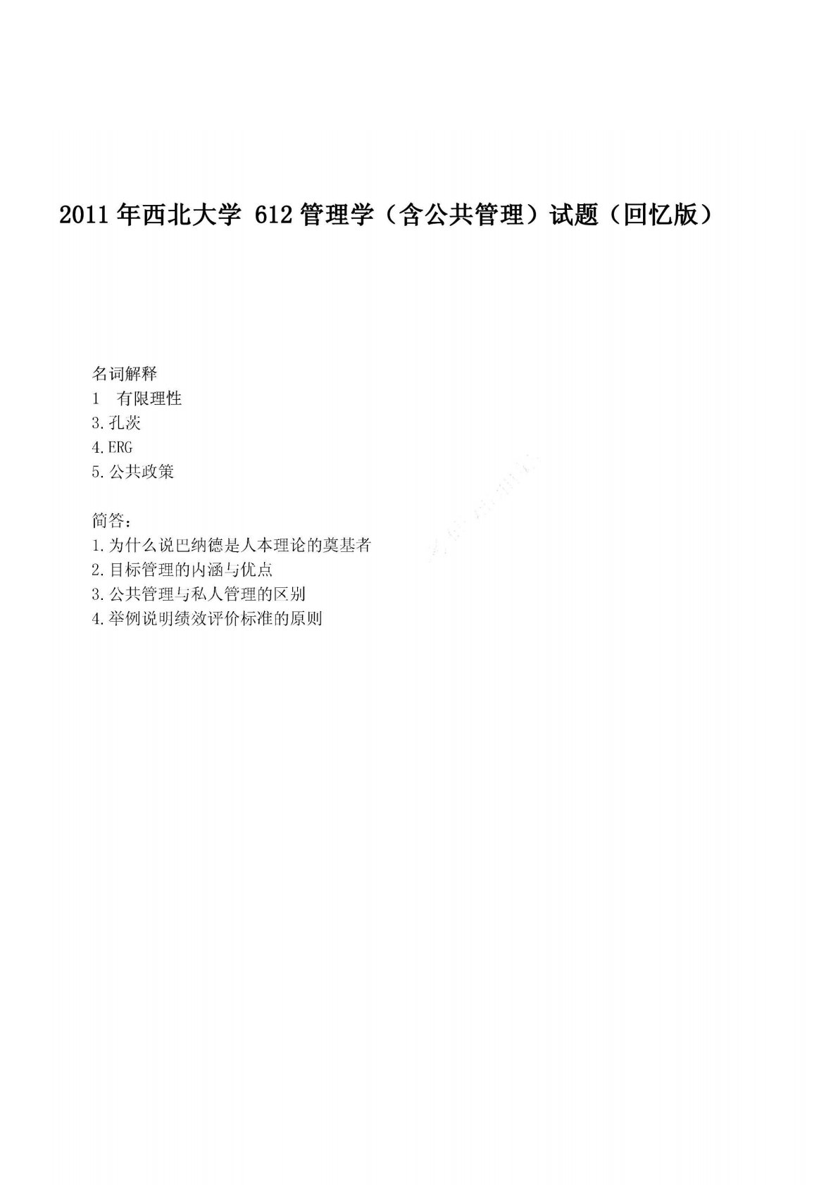 西北大学612管理学(含公共管理学)2011年真题回忆版