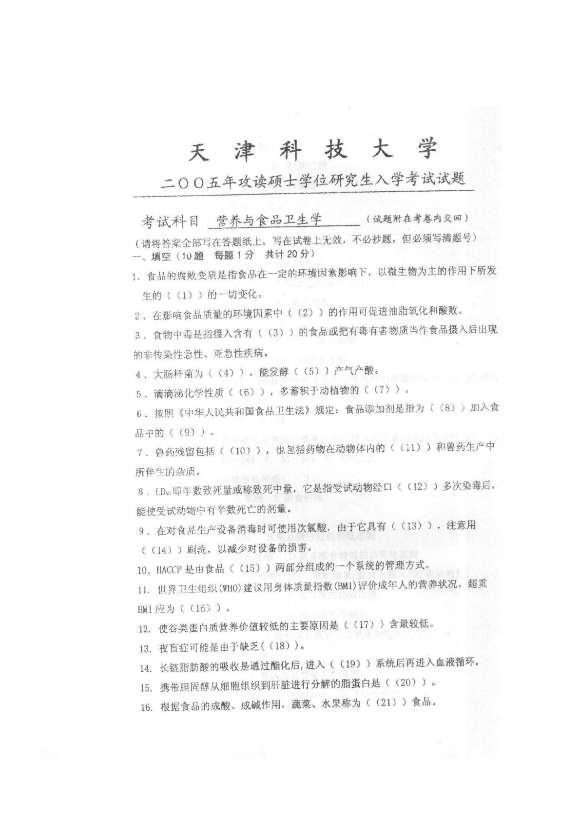 天津科技大学713营养与食品卫生学专业基础综合2005年真题