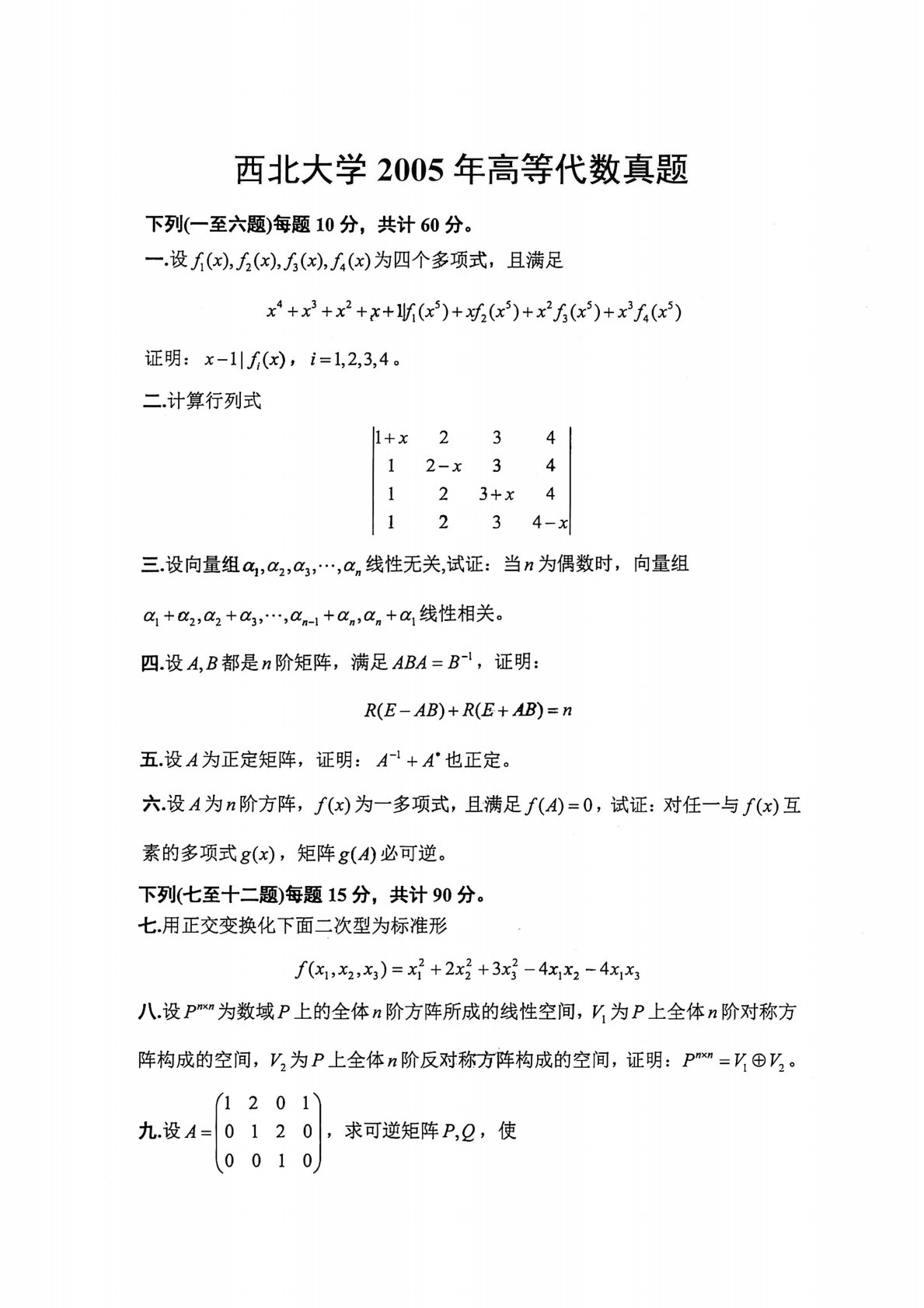 西北大学821高等代数2005年真题