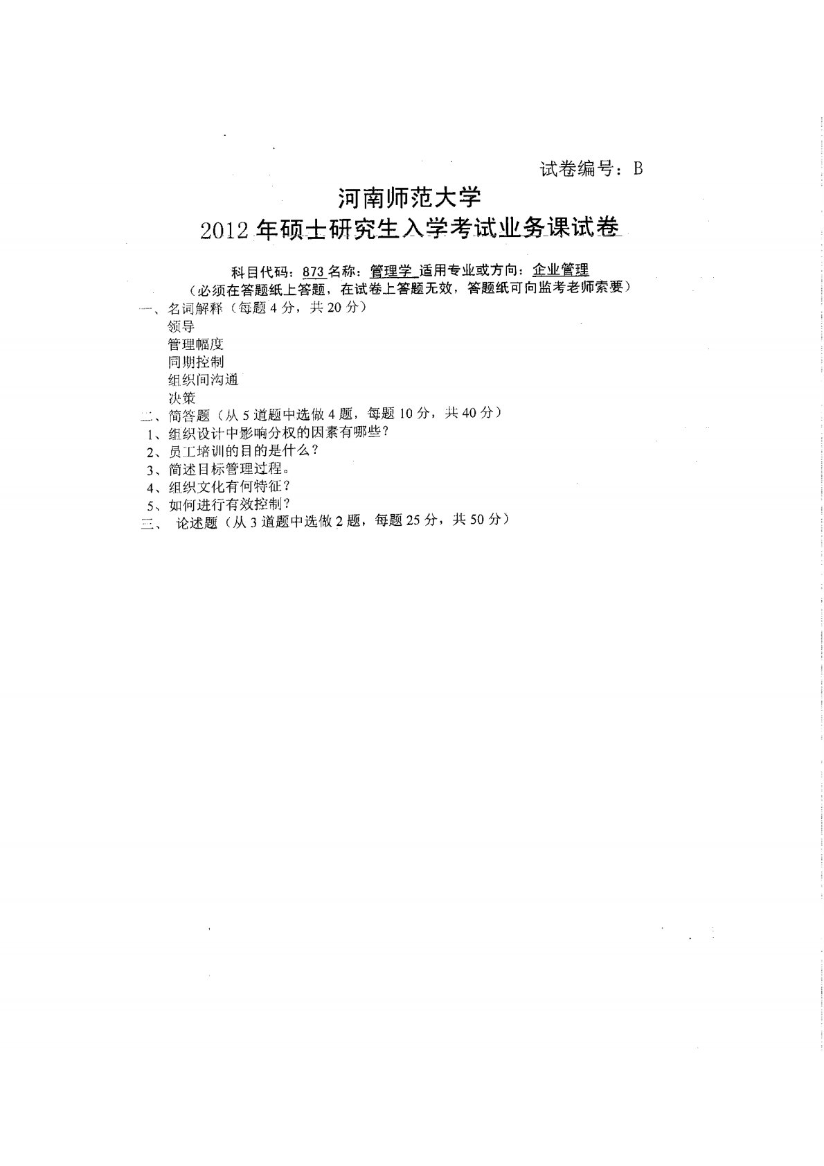 河南师范大学877管理学2012年真题