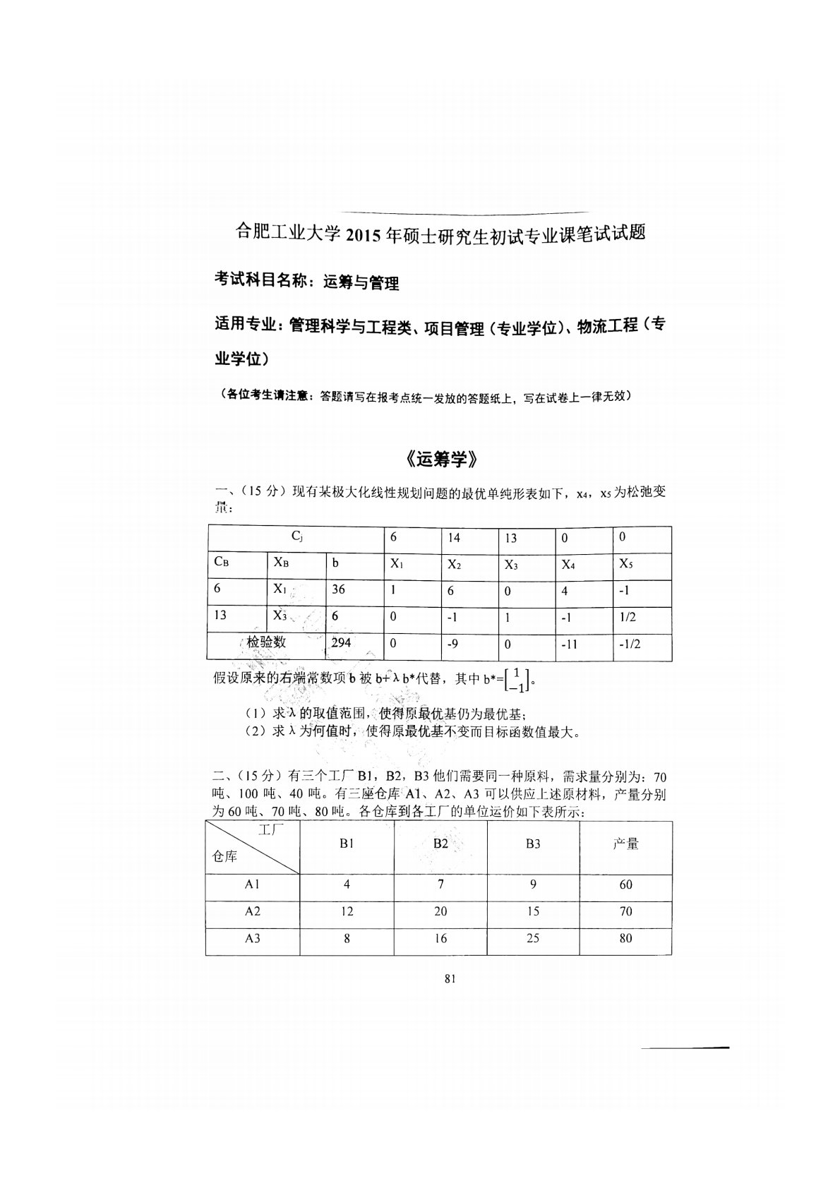 合肥工业大学846运筹与管理2015年真题