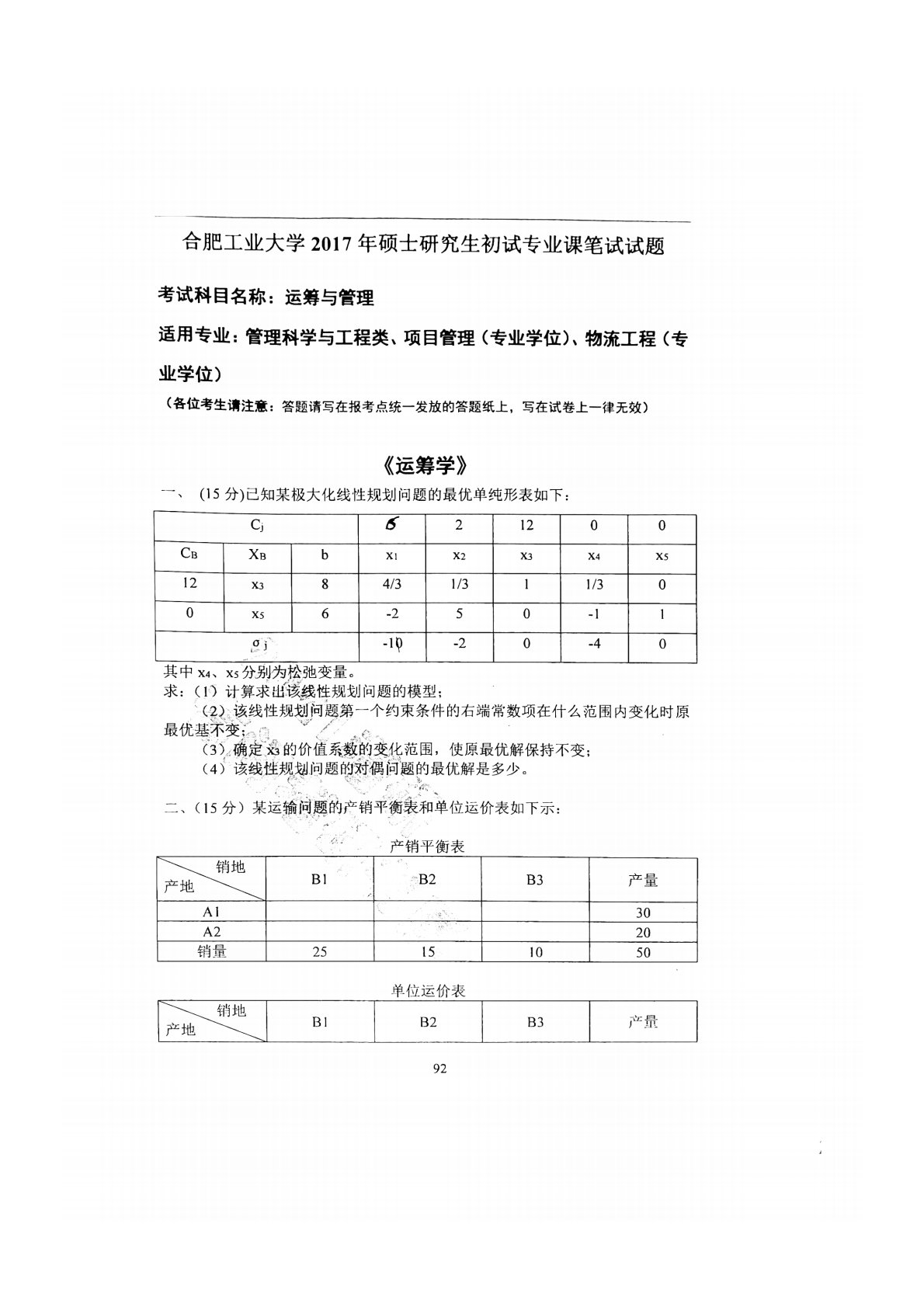 合肥工业大学846运筹与管理2017年真题