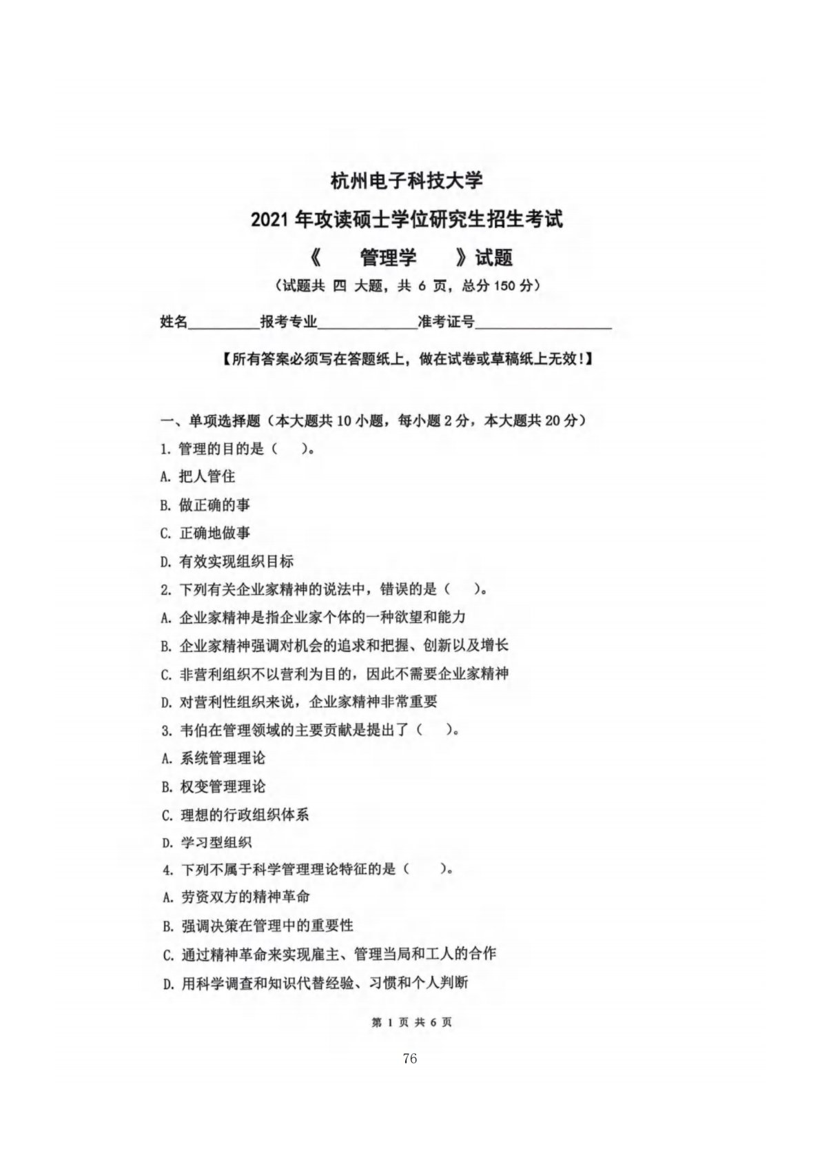杭州电子科技大学831管理学2021年真题