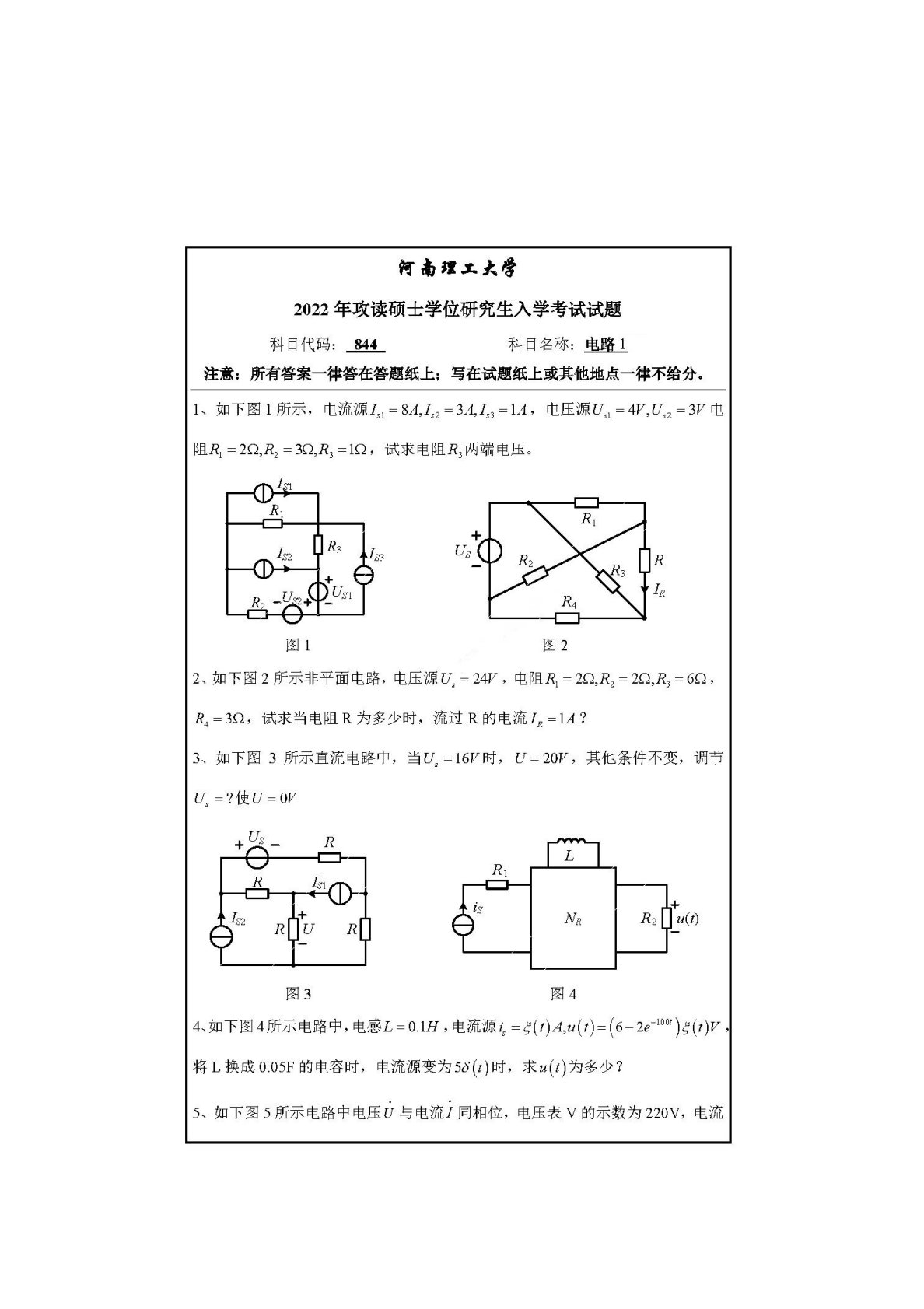 河南理工大学844电路理论2022年真题