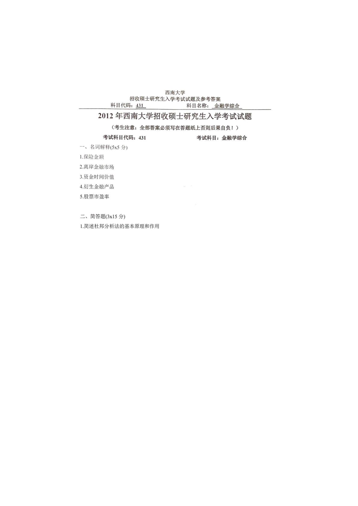 西南大学431金融学综合2012年真题