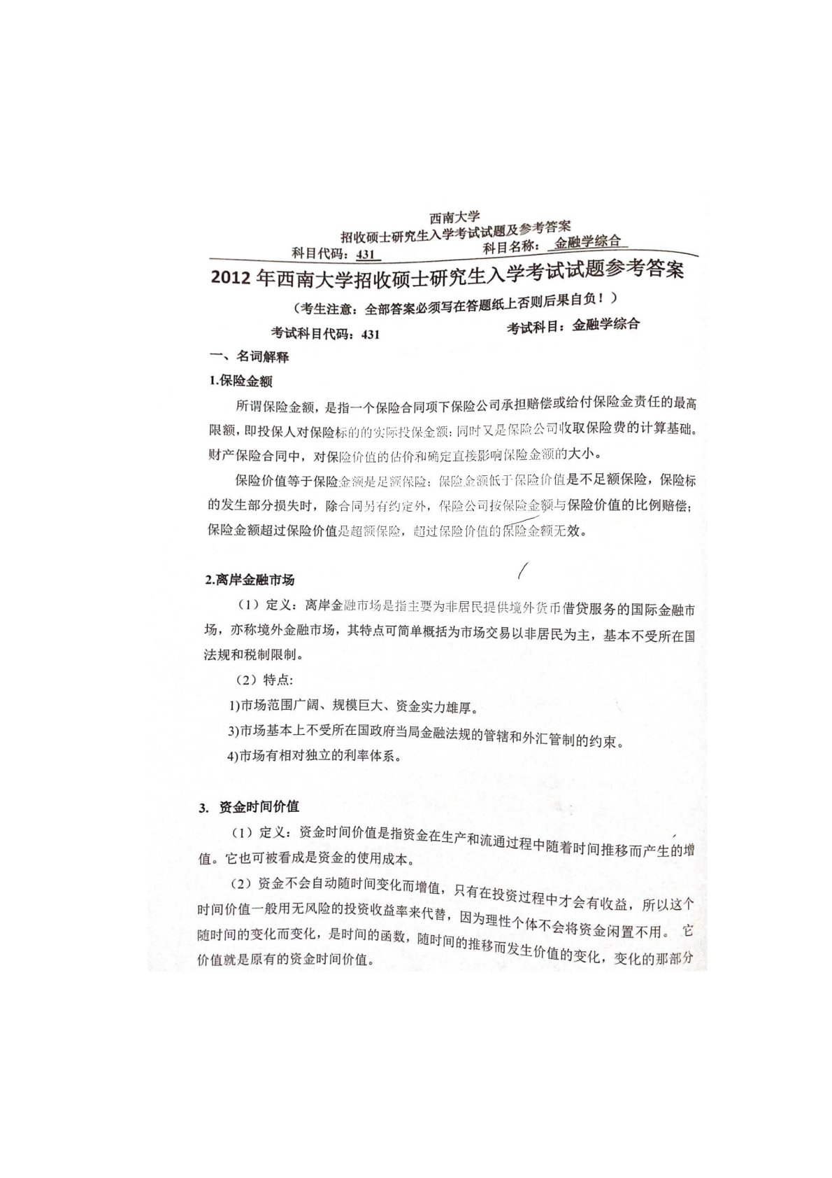 西南大学431金融学综合2012年真题答案