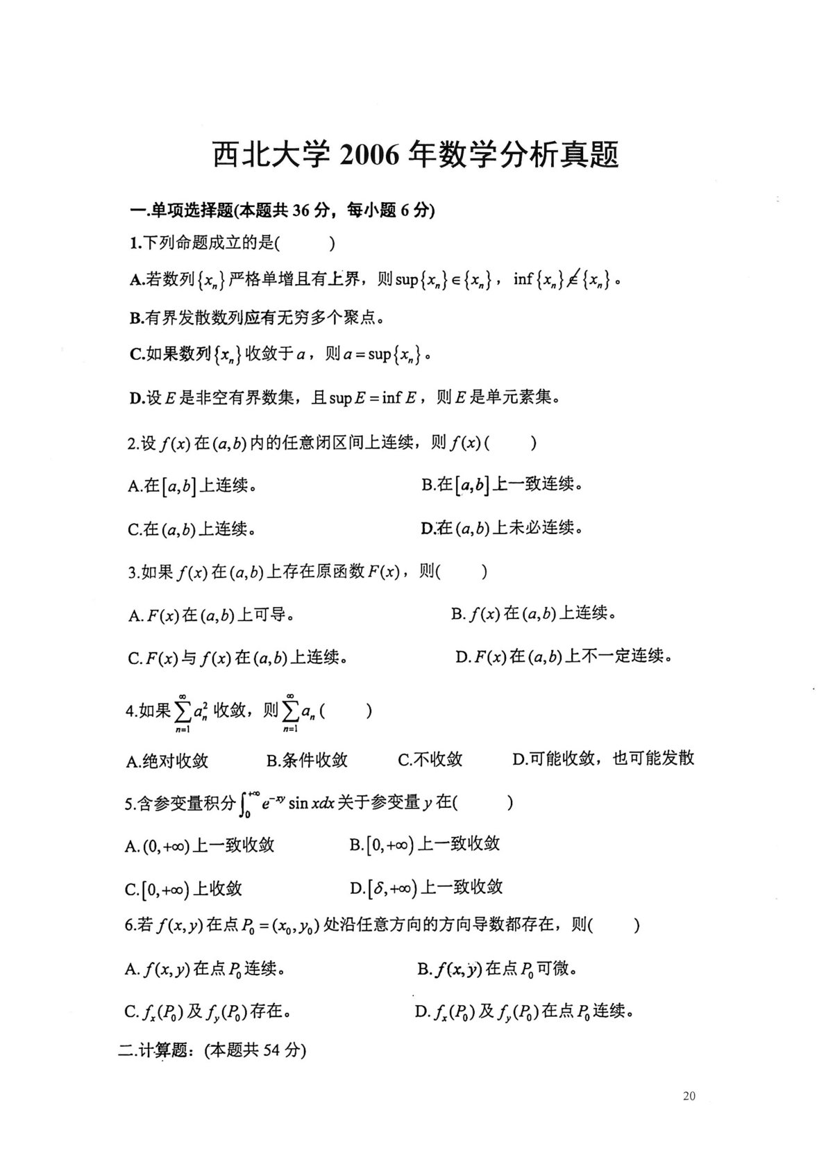 西北大学632数学分析2006年真题