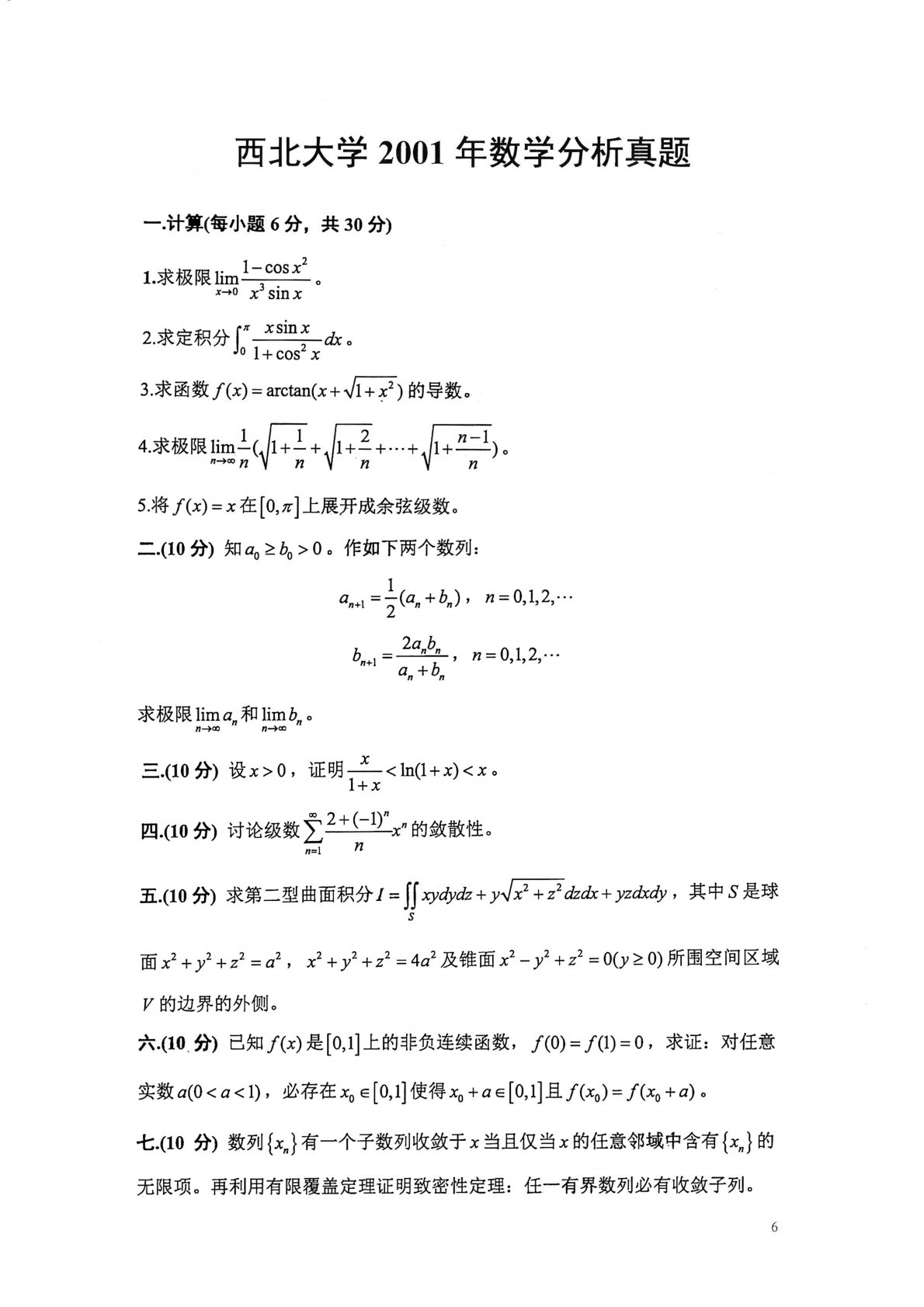 西北大学632数学分析2001年真题