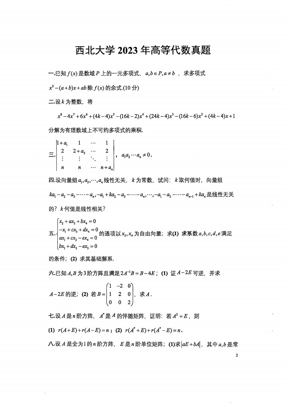 西北大学821高等代数2023年真题