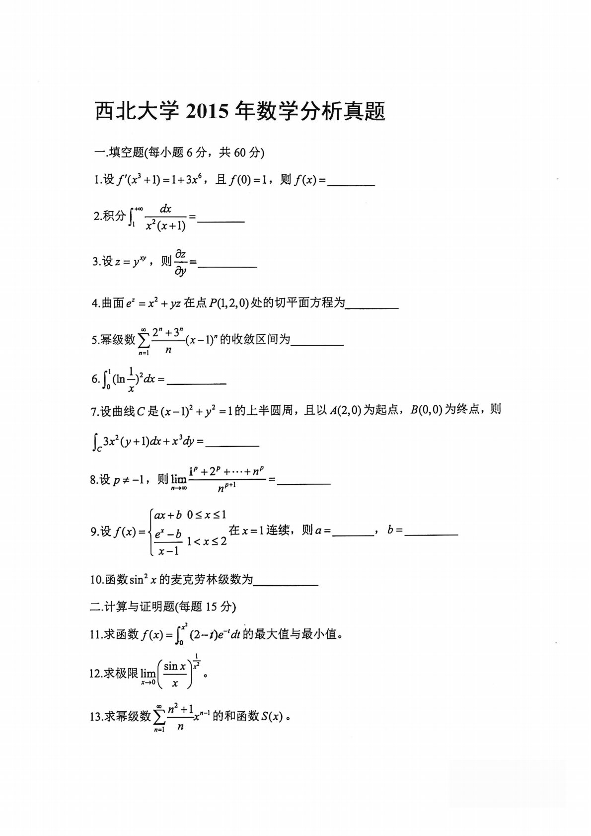 西北大学632数学分析2015年真题