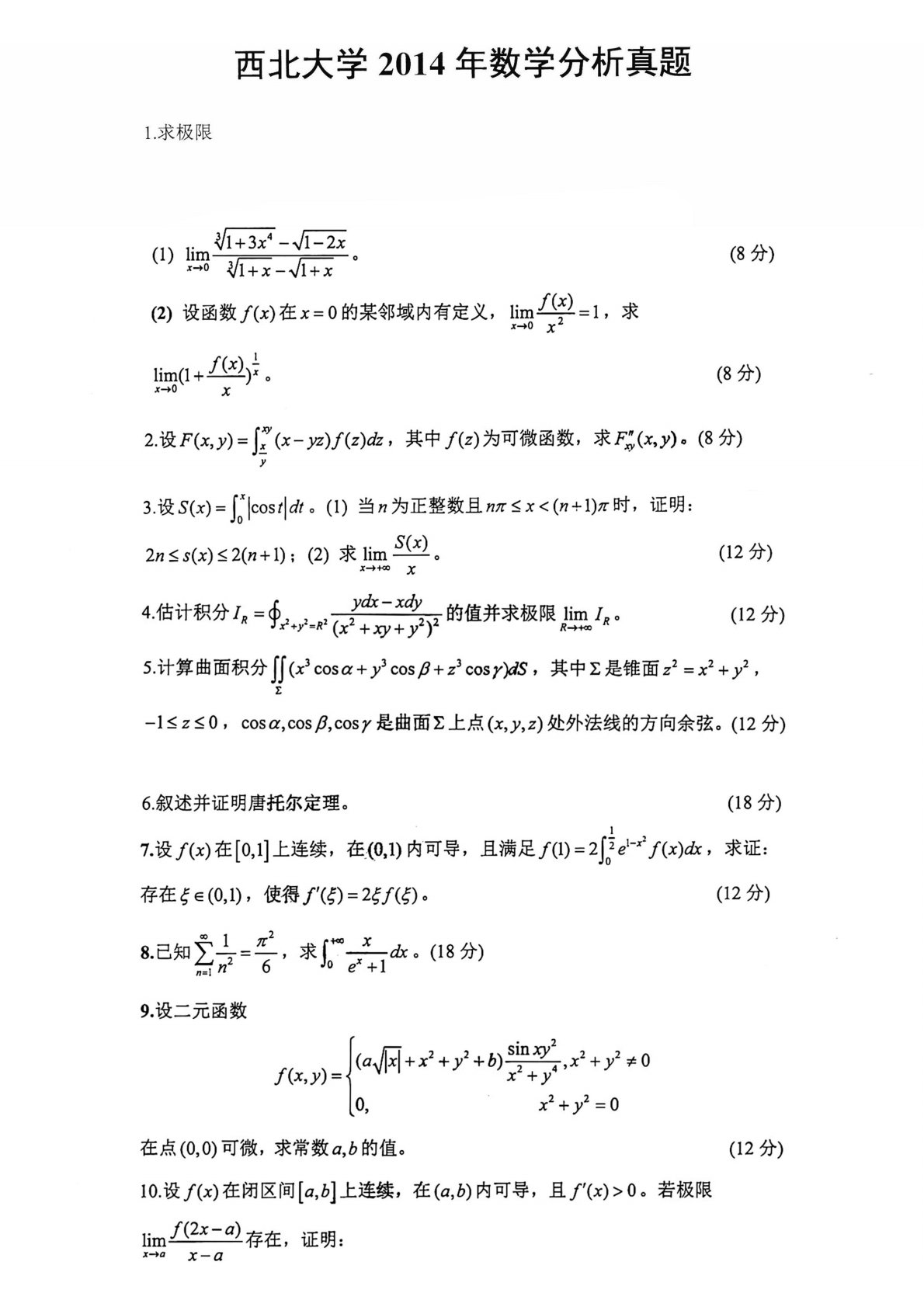 西北大学632数学分析2014年真题