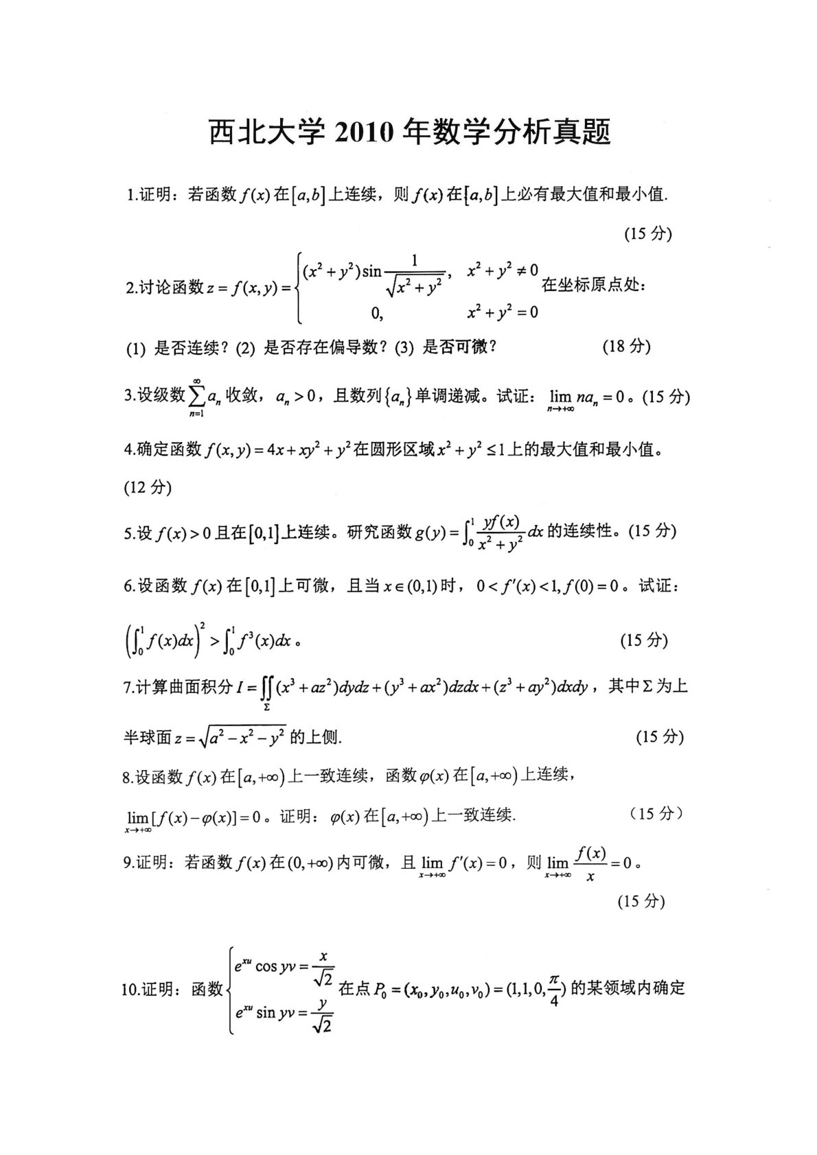 西北大学632数学分析2010年真题