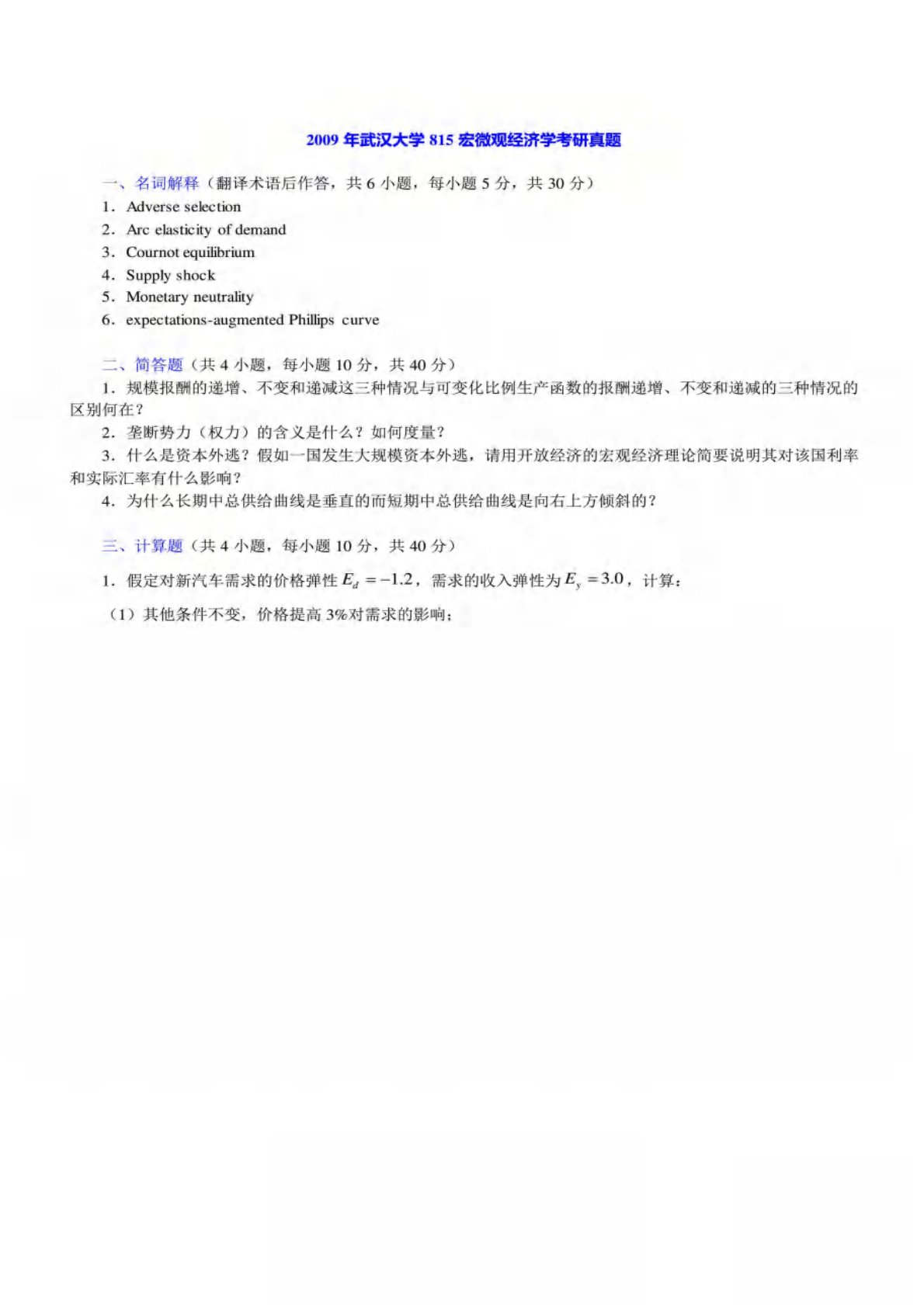 武汉大学819宏微观经济学2009年真题