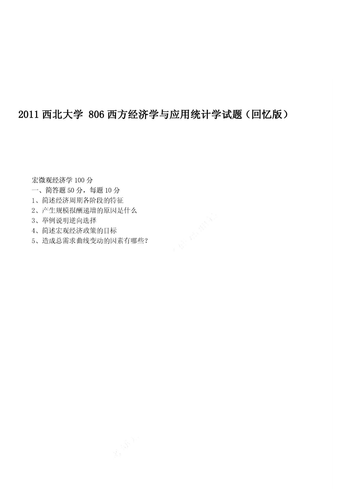 西北大学806西方经济学与应用统计学2011年真题回忆版
